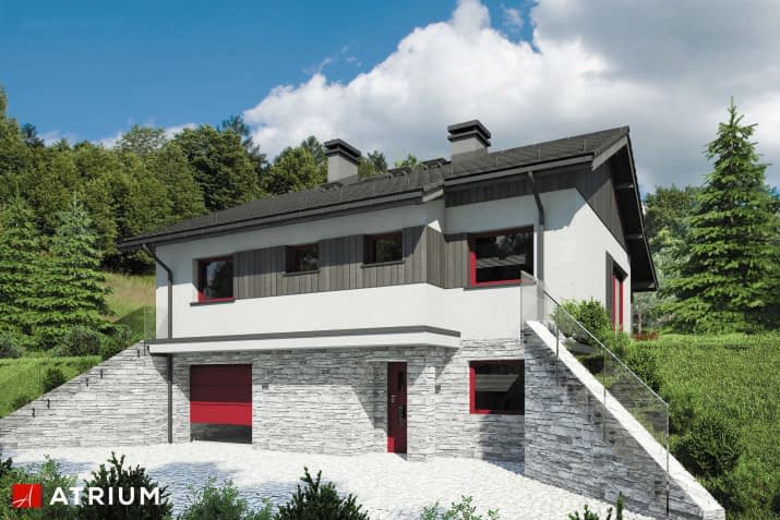 Podpiwniczony parterowy dom jednorodzinny, wolnostojący, na działkę ze skarpą, z garażem w piwnicy
