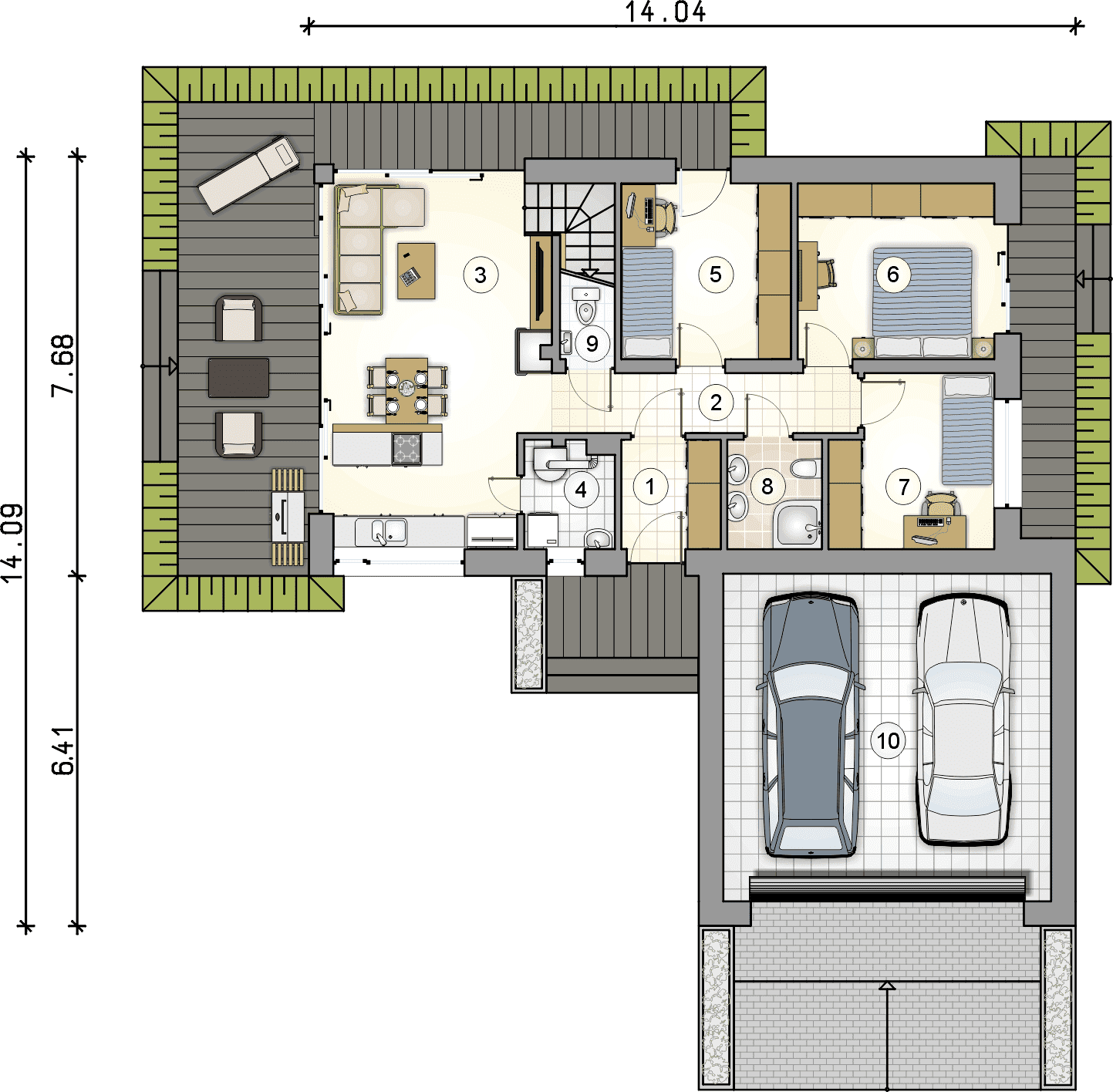 Technologia murowana: pustak ceramiczny gr. 25 cm + ocieplenie w systemie Termo Organika. Pokrycie dachu: blacha tytanowo-cynkowa. Brama garażowa i drzwi zewnętrzne marki Hörmann.Rzuty