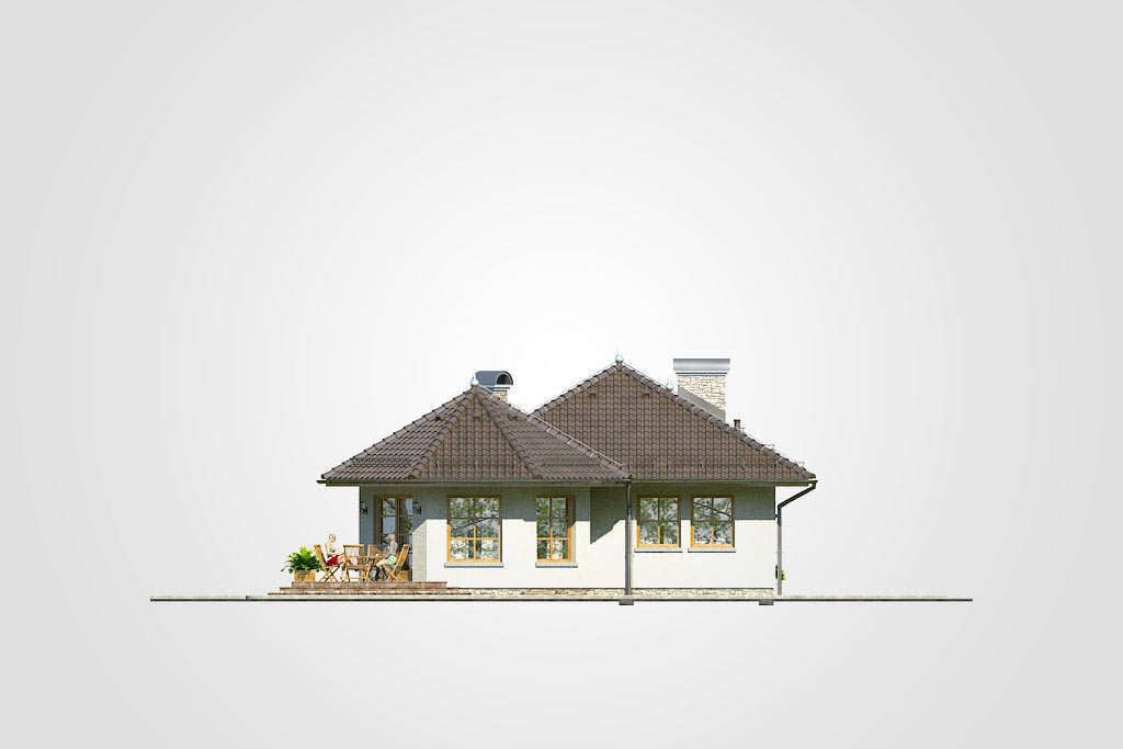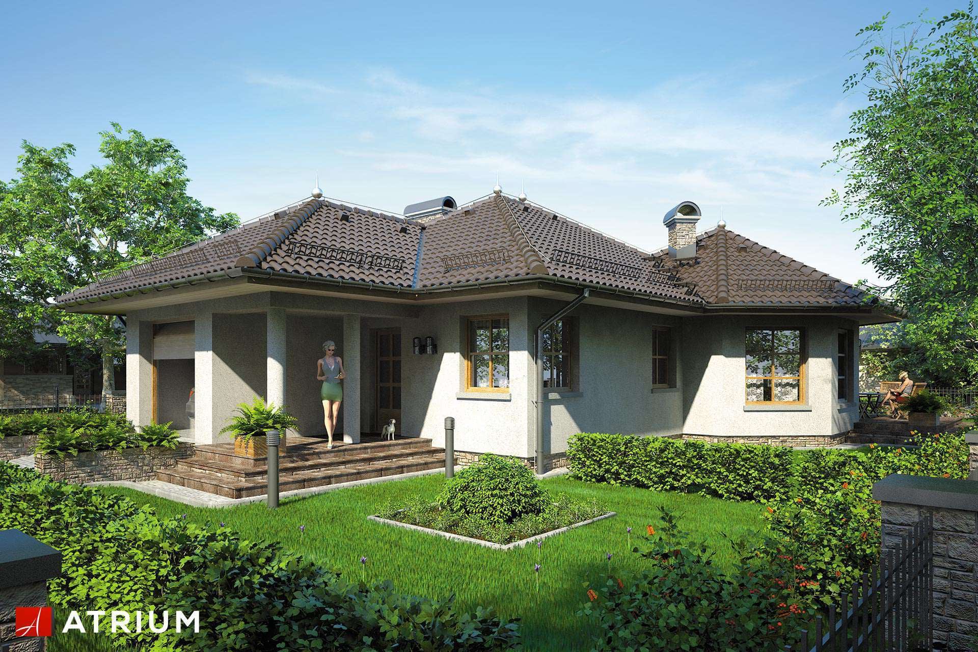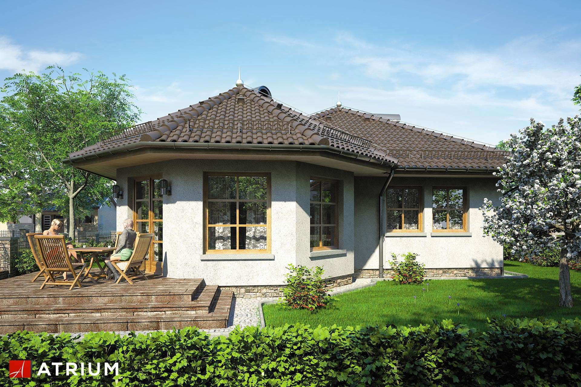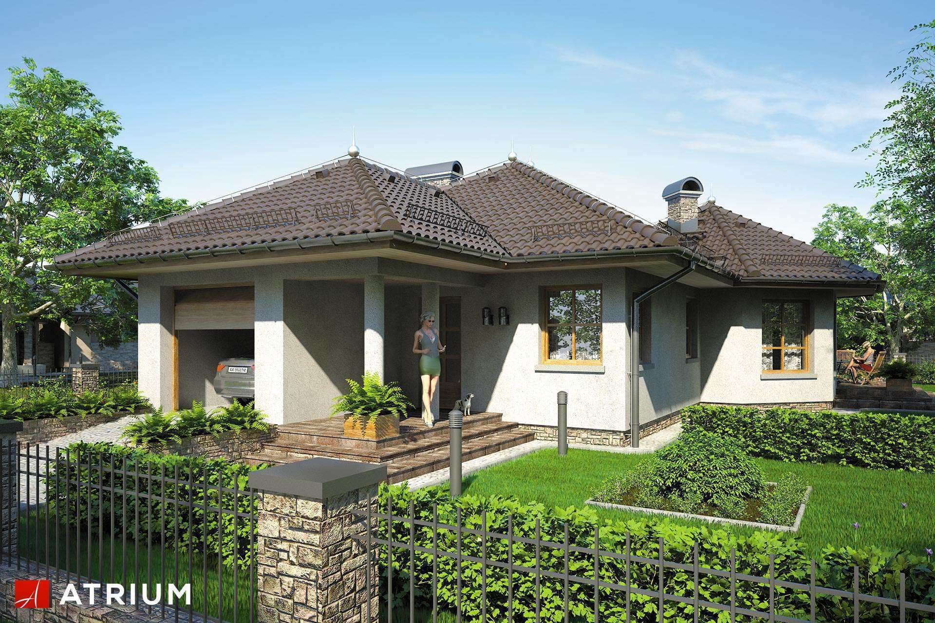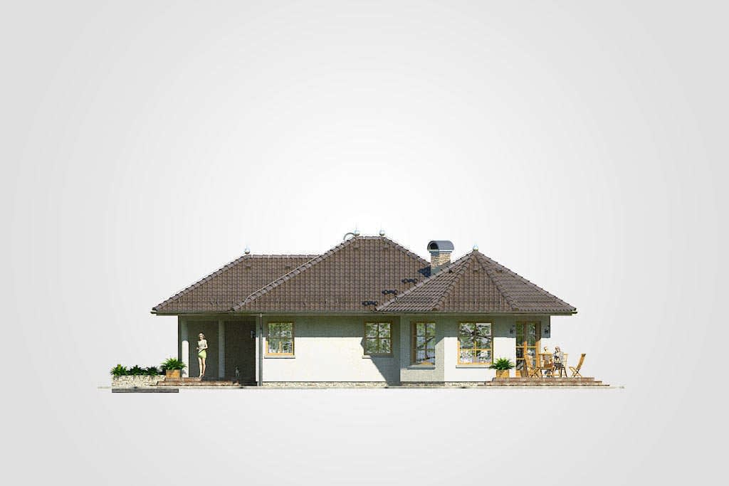 Dom parterowy z wielospadowym dachem, przeszkloną wieżyczką, tarasem oraz garażem, energooszczędnyKonstrukcja