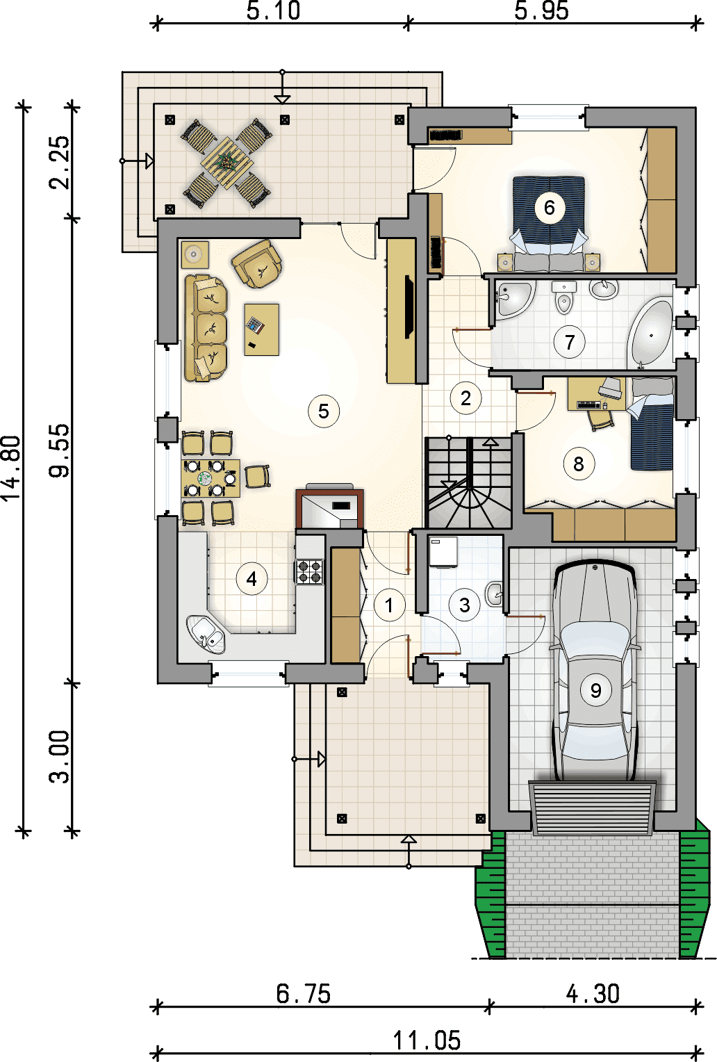 Dom parterowy z poddaszem użytkowym i garażem, narożny taras w podcieniu, podpiwniczonyKonstrukcja