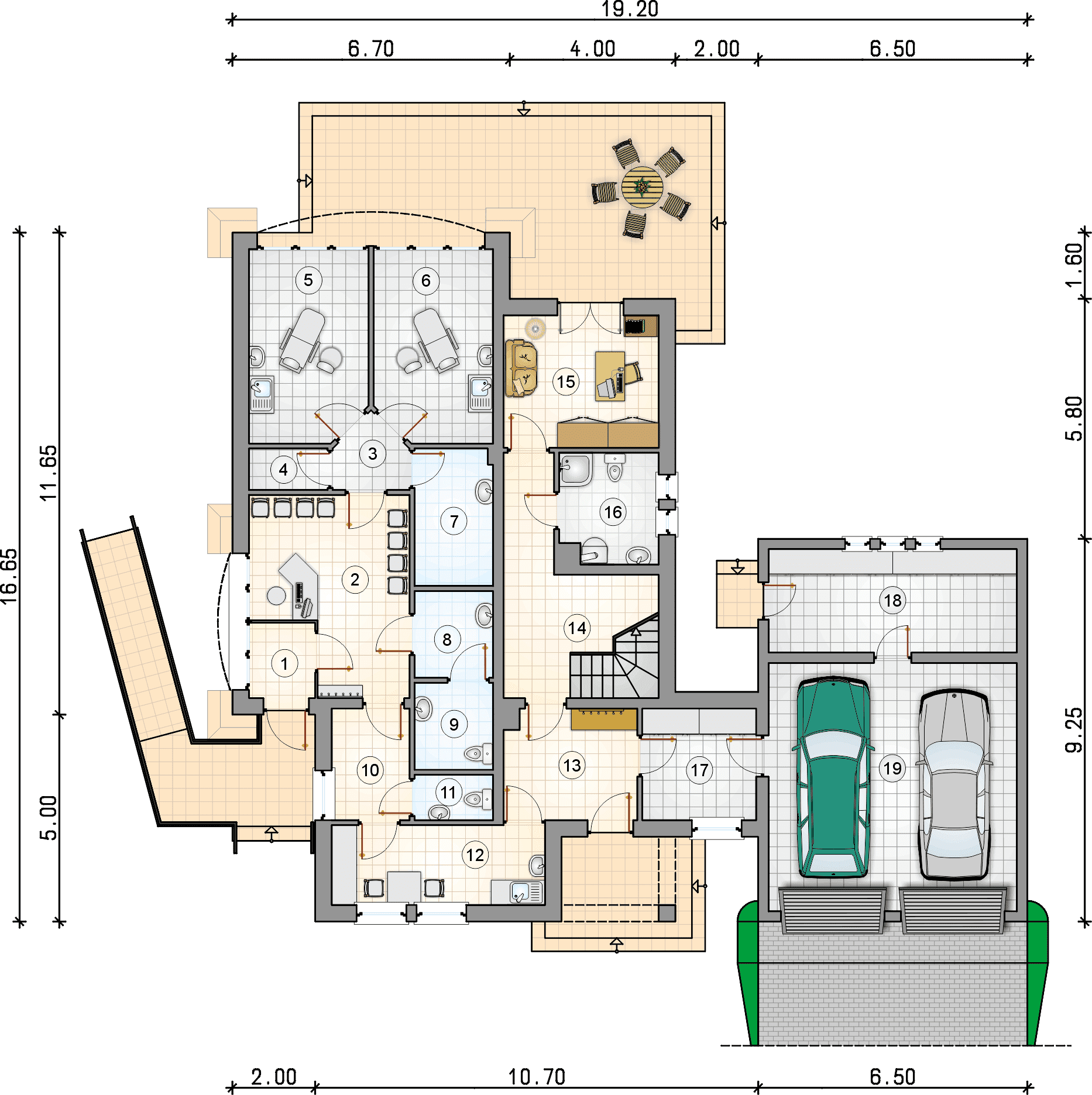 Technologia murowana: Pustak ceramiczny gr. 30 cm + ocieplenie w systemie Termo Organika. Pokrycie dachu dachówką cementową. Brama garażowa i drzwi zewnętrzne marki Hörmann.Rzuty