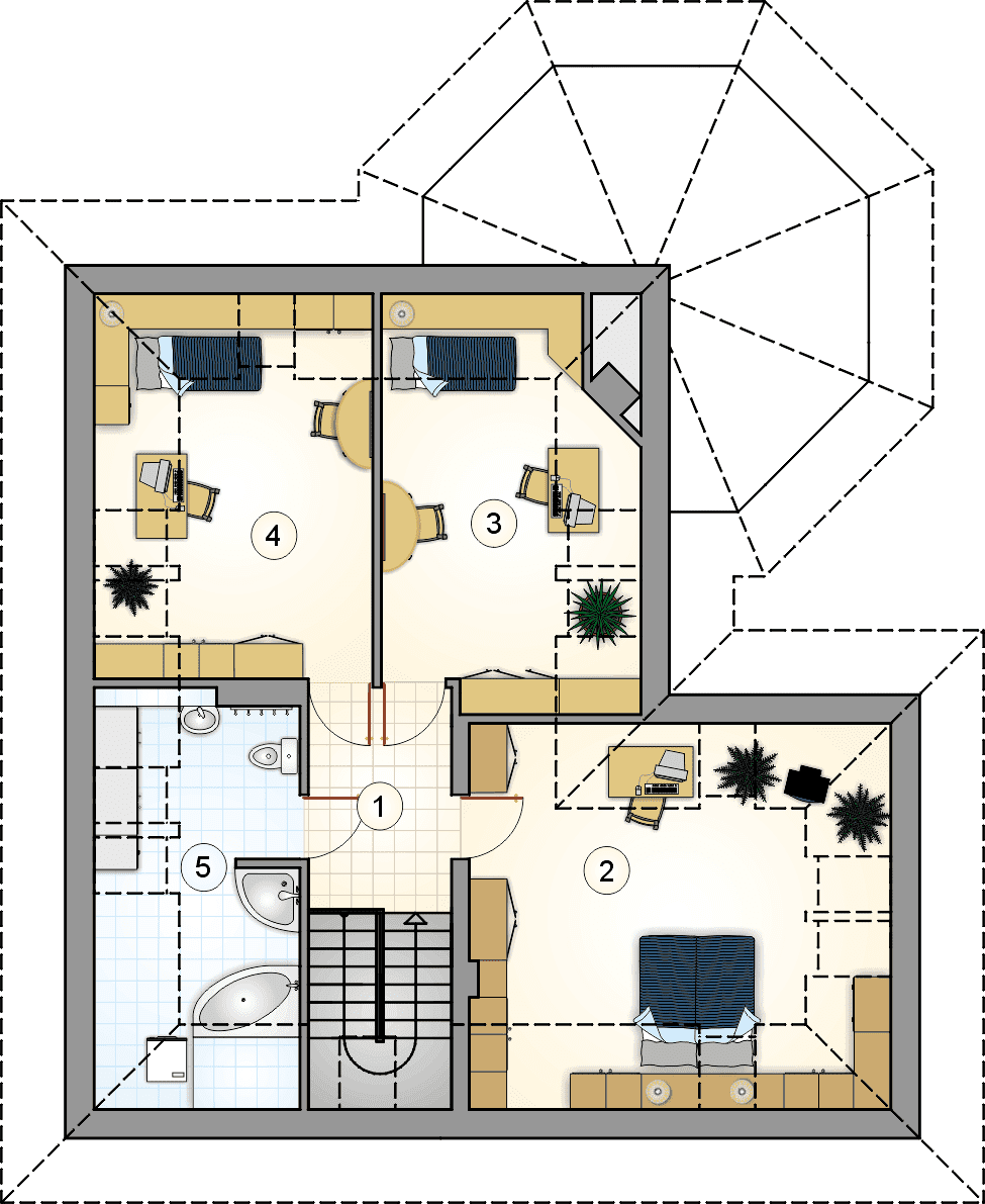Dom z wielospadowym dachem, parterowy, z poddaszem użytkowym i garażem, z przeszkloną wieżyczką i 4 sypialniamiKonstrukcja