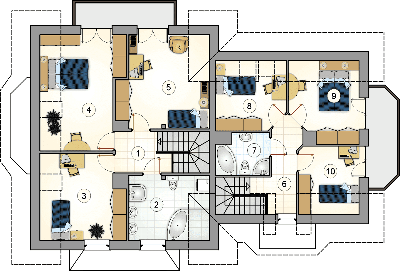 Technologia murowana: Pustak ceramiczny gr. 30 cm + ocieplenie w systemie Termo Organika. Pokrycie dachu dachówką cementową. Drzwi zewnętrzne marki Hörmann.Rzuty
