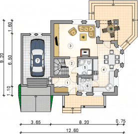 Technologia murowana: Pustak ceramiczny gr. 30 cm + ocieplenie w systemie Termo Organika. Pokrycie dachu dachówką cementową. Brama garażowa i drzwi zewnętrzne marki Hörmann.Rzuty