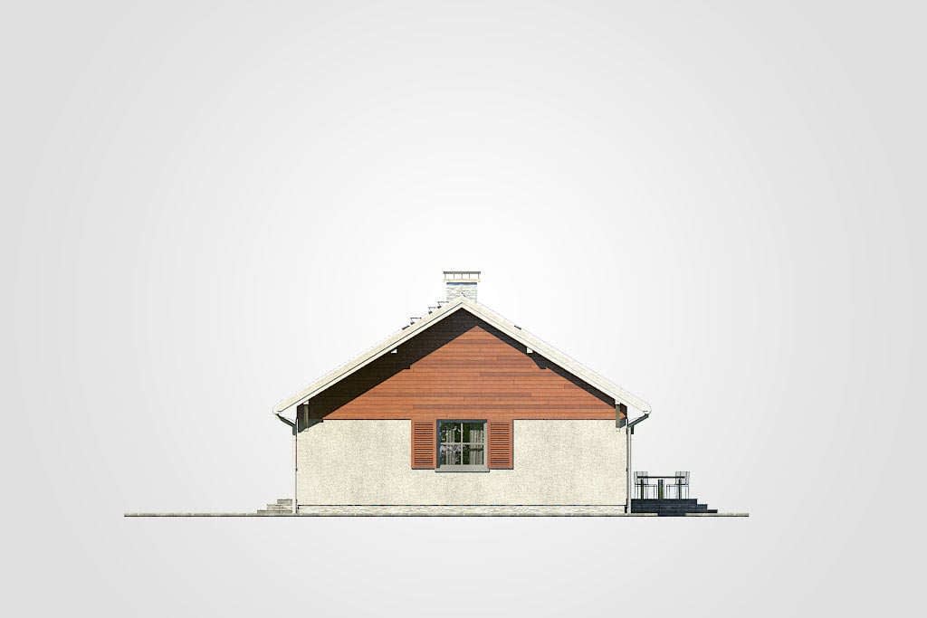 Mały dom parterowy z klasycznym dwuspadowym dachem i strychem, odkrytym tarasem z boku budynku