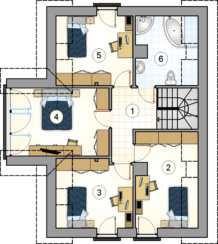 Dom parterowy z poddaszem użytkowym i 4 sypialniami, ryzalitem i garażem, idealny na działki z wjazdem od południaKonstrukcja