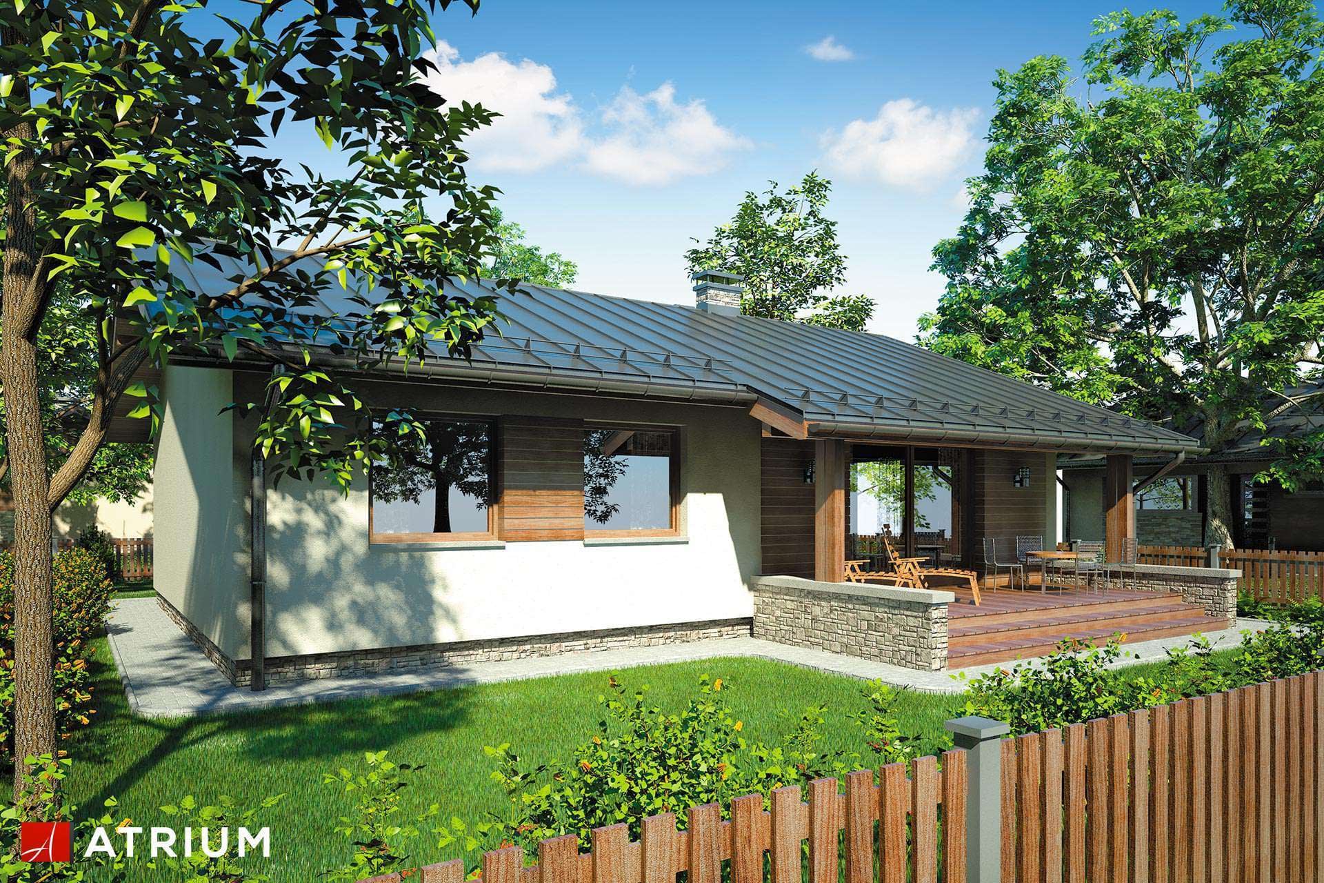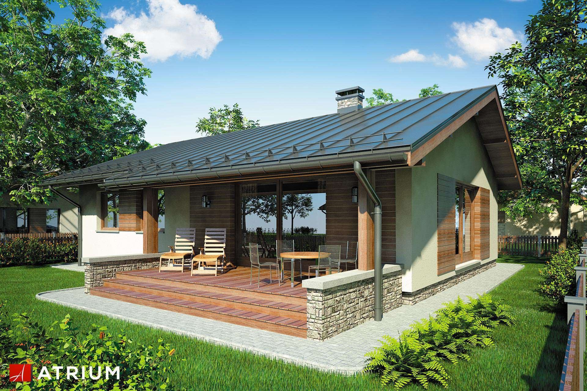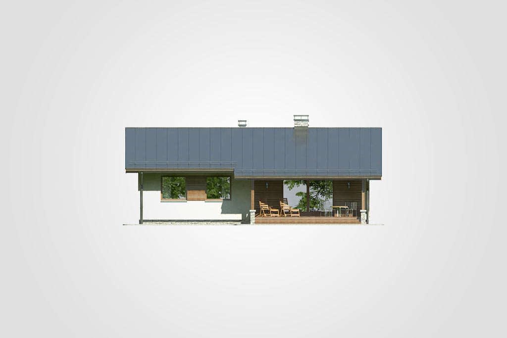Energooszczędny dom parterowy z zadaszonym tarasem i dwuspadowym dachem