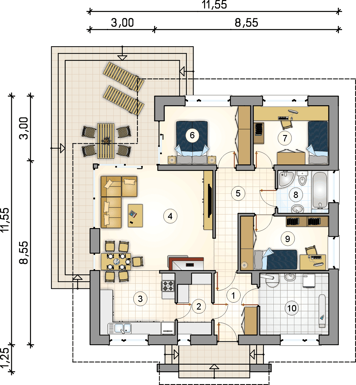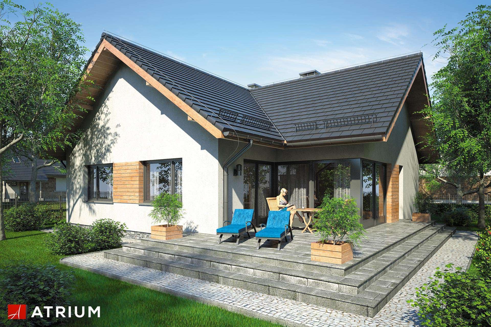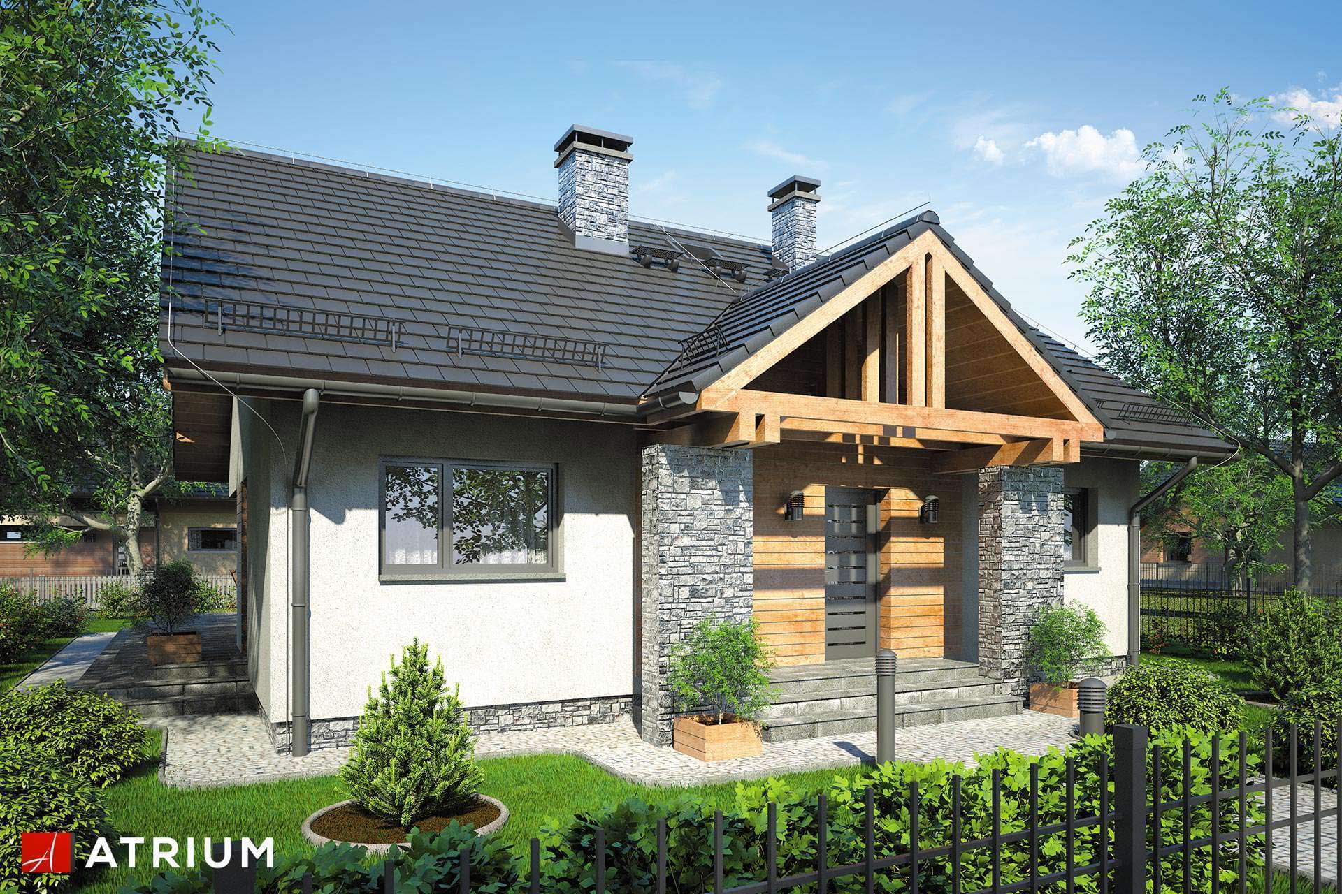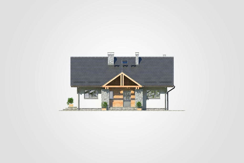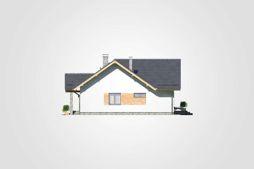Niewielki dom parterowy z dwuspadowym dachem, odkrytym, narożnym tarasem i oryginalnym wejściem z kamiennymi przyporamiKonstrukcja