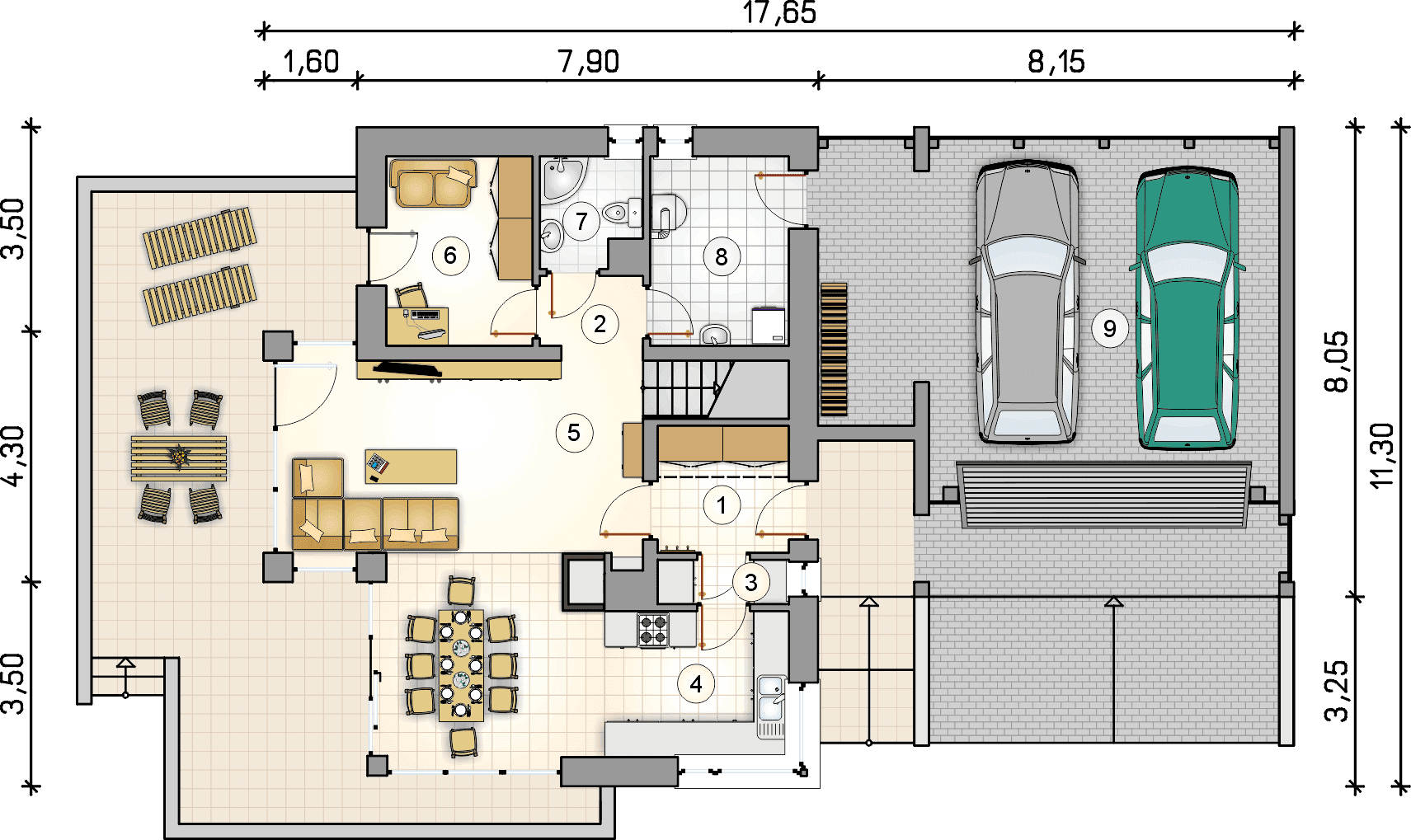 Technologia murowana: Pustak ceramiczny gr. 30 cm + ocieplenie w systemie Termo Organika. Pokrycie dachu: część mieszkalna - dachówka cementowa, garaż - papa termozgrzewalna. Brama garażowa i drzwi zewnętrzne marki Hörmann.Rzuty