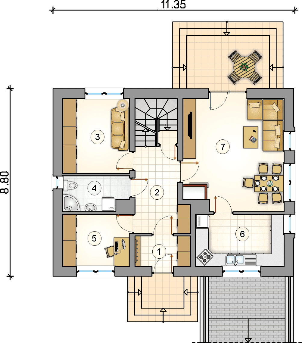 Technologia murowana: Pustak ceramiczny gr. 30 cm + ocieplenie w systemie Termo Organika. Pokrycie dachu dachówką cementową. Brama garażowa i drzwi zewnętrzne marki Hörmann.Rzuty