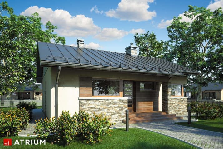 Mały dom parterowy w technologii szkieletowej o starannie dopracowanym detalu architektonicznym, z częściowo zadaszonym tarasemKonstrukcja