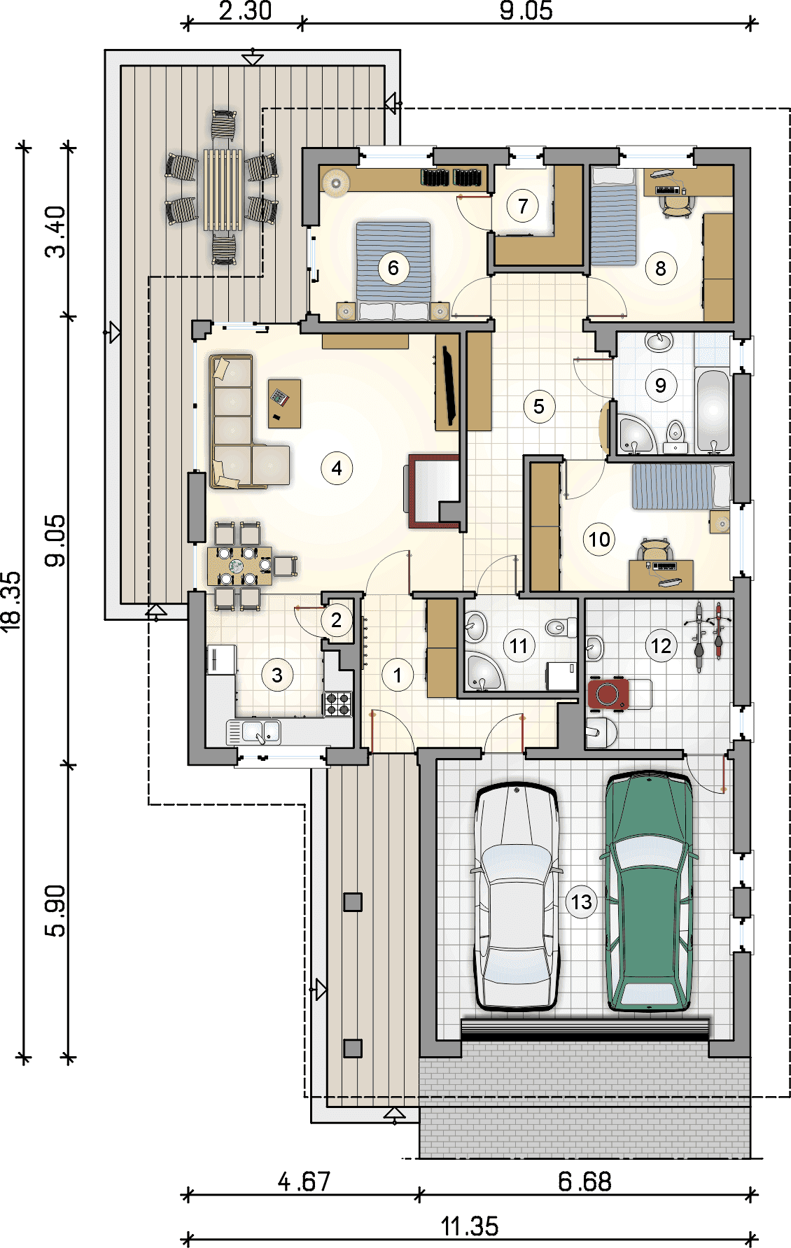 Ściany w szkielecie drewnianym + ocieplenie z wełny mineralnej + płyty OSB + ocieplenie w systemie Termo Organika. Pokrycie dachu: dachówka cementowa. Brama garażowa i drzwi zewnętrzne marki Hörmann.Rzuty