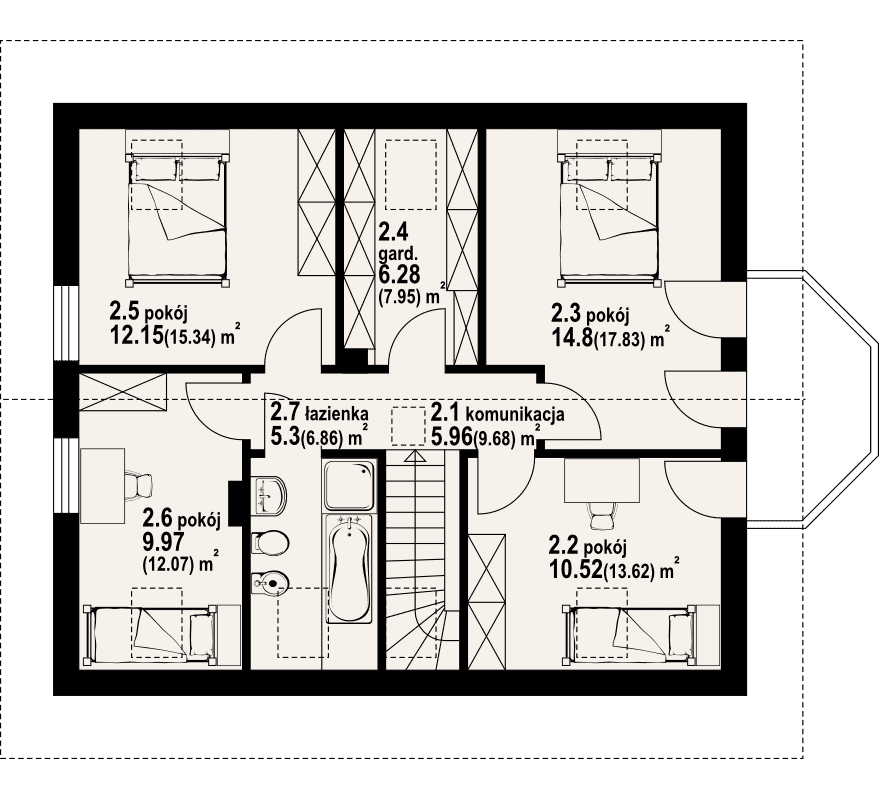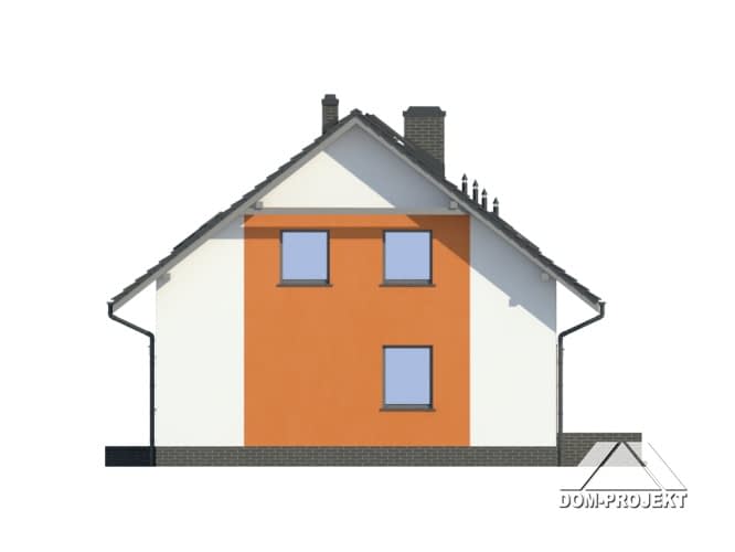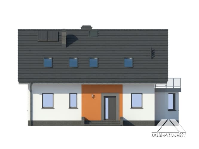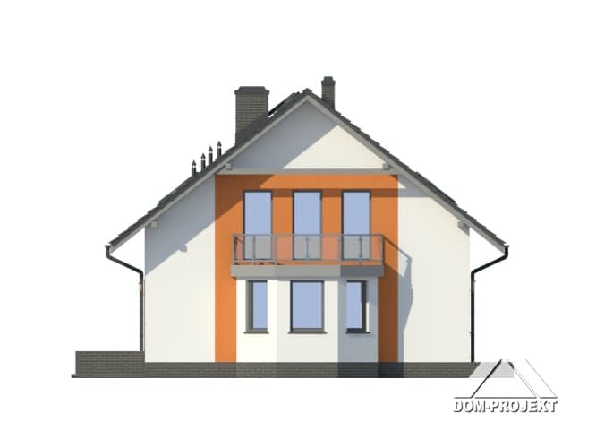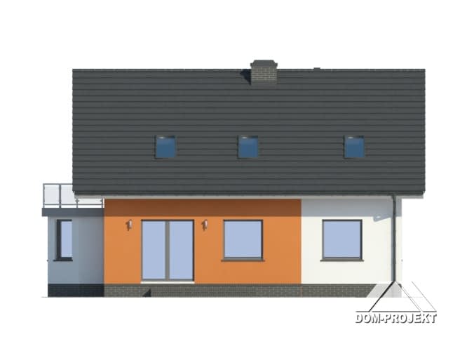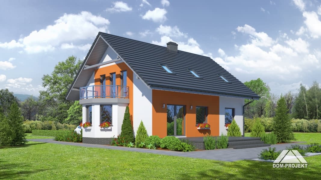 Dom z poddaszem użytkowym. Duży salon z kominkiem, wyjściem na taras i aneksem kuchennym. Sypialnia, łazienka, kotłownia, komunikacja. Na poddaszu cztery pokoje, łazienka, garderoba, komunikacja i balkon. Prosta bryła budynku i dach dwuspadowy sprzyjają taniej i szybkiej budowie oraz niskim kosztom eksploatacji.Rzuty