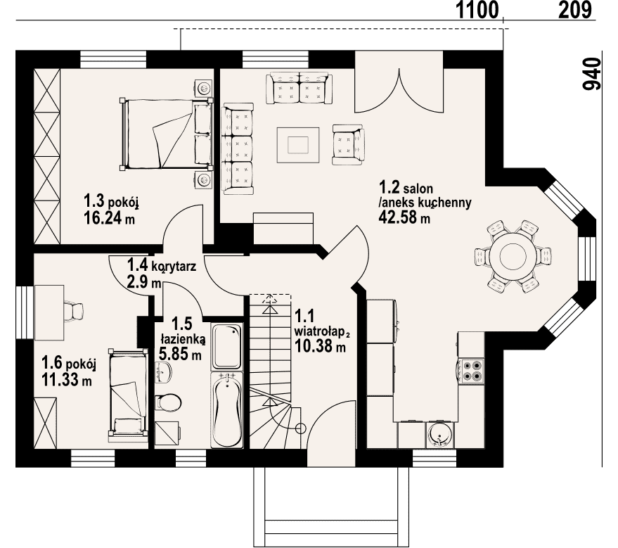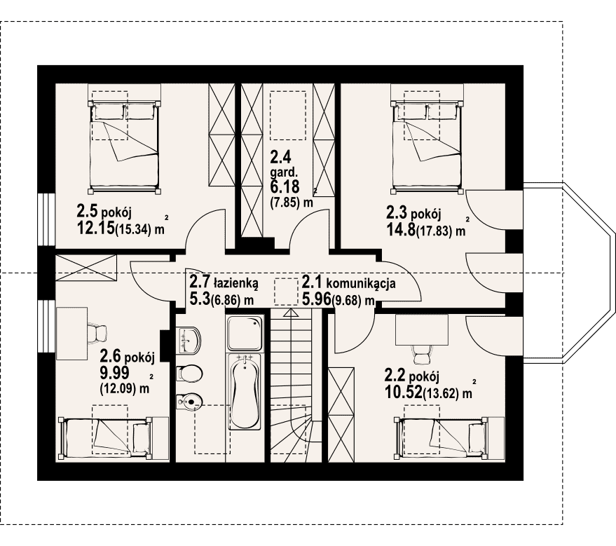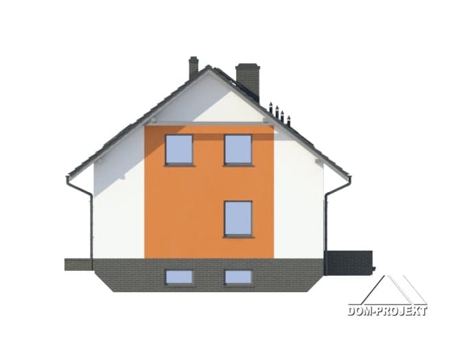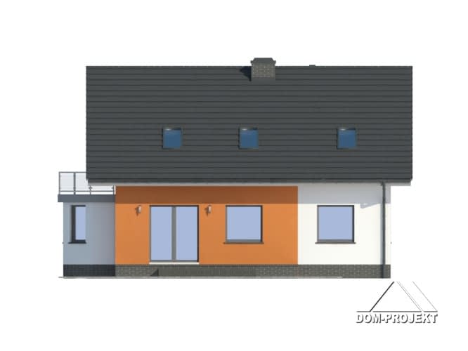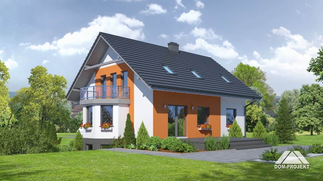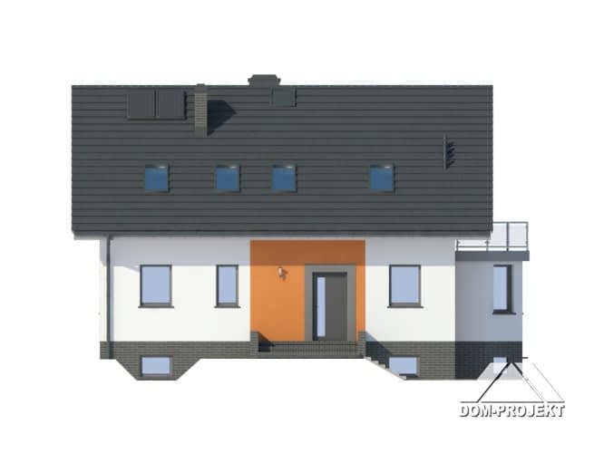 Dom z poddaszem użytkowym i piwnicami. Duży salon z kominkiem, wyjściem na taras i aneksem kuchennym. Dwa pokoje, łazienka i komunikacja. Na poddaszu cztery pokoje, łazienka, garderoba, komunikacja i balkon. W piwnicach pomieszczenie hobby, kuchnia gospodarcza, kotłownia, piwnica i komunikacja Prosta bryła budynku i dach dwuspadowy sprzyjają taniej i szybkiej budowie oraz niskim kosztom eksploatacji.Rzuty
