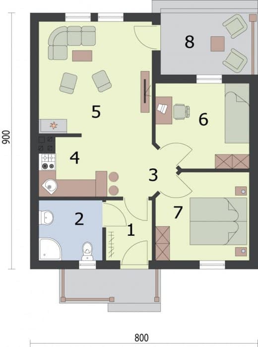 Po lewej stronie znajduje się łazienka, natomiast po prawej stronie komunikacji jest dość obszerna sypialnia. Od przedpokoju na lewo usytuowany jest pokój dzienny z kominkiem, kuchnia jest półotwartym pomieszczeniem. Taras znajdujący się od północnej strony z pewnością będzie miejscem niejednej wesołej biesiady.