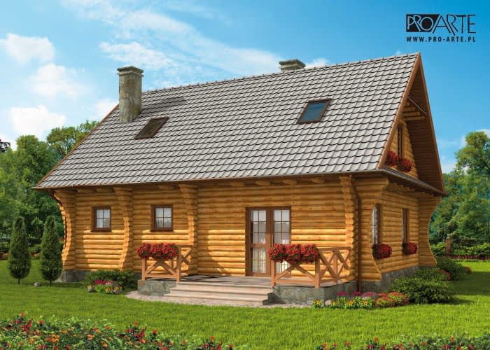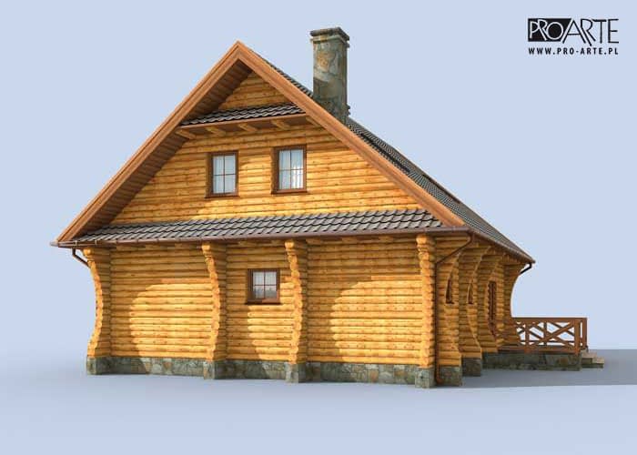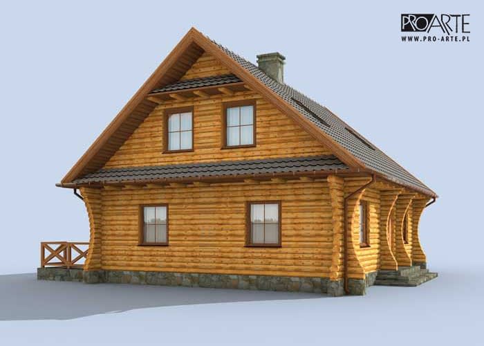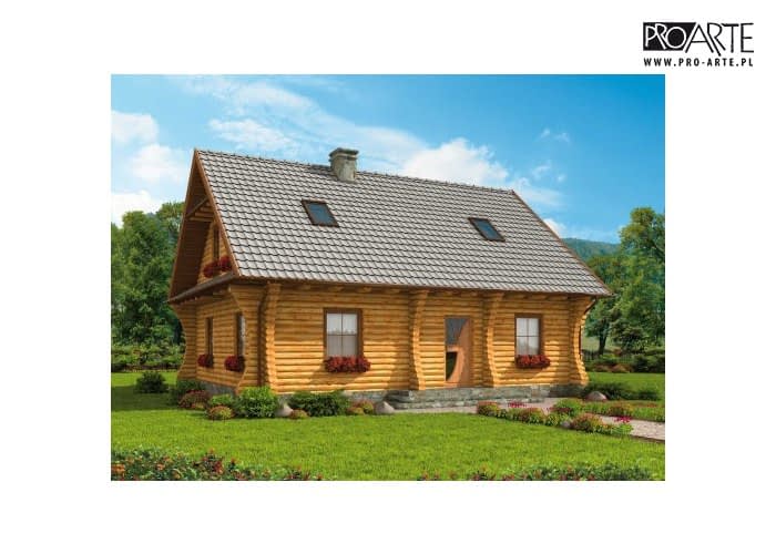 Santa Cruz - bale - dom z bali Urokliwy i ekologiczny dom w w technologii balowej, jego zwarta bryła wyróżnia się klasyczną prostotą i wyważonymi proporcjami. Szeroka wejściowa wnęka, symetrycznie rozmieszczone okna parteru i poddasza, dwuspadowy dach i zgrabna wiata tworzą efektowną całość. Na tyłach domu znajduje się taras, prowadzący bezpośrednio do ogrodu. Miejscem, gdzie koncentruje się życie domowników jest pokój dzienny połączony z kuchnią, w której wydzielono kącik jadalny. Na parterze jest także pomieszczenie idealne na zaciszny gabinet. Oprócz tego na parterze znajduje się łazienka i kotłownia, z której wchodzi się do praktycznego, przydatnego w każdym domu pomieszczenia gospodarczego, stamtąd zaś prowadzi wyjście na zewnątrz pod wiatę. Trzy kameralne i przytulne pokoje na poddaszu zapewnią mieszkańcom domu, tak potrzebną każdemu atmosferę spokoju i prywatności. Na górze jest także łazienka. Powierzchnię użytkową poddasza policzono do 1,9m.