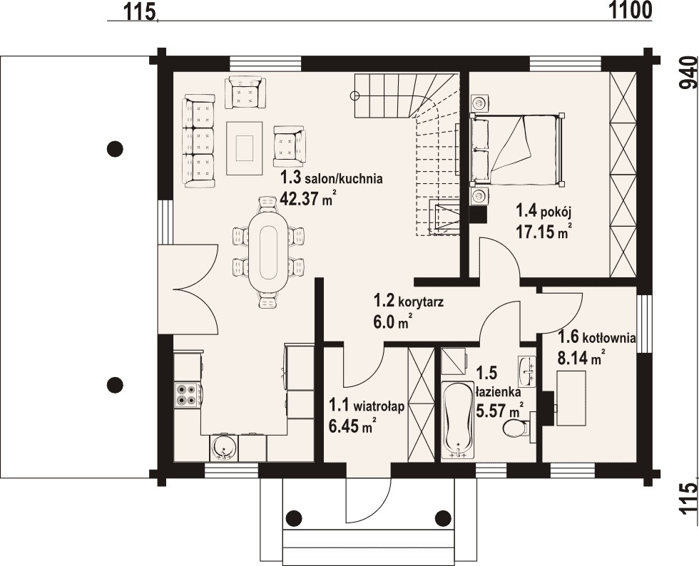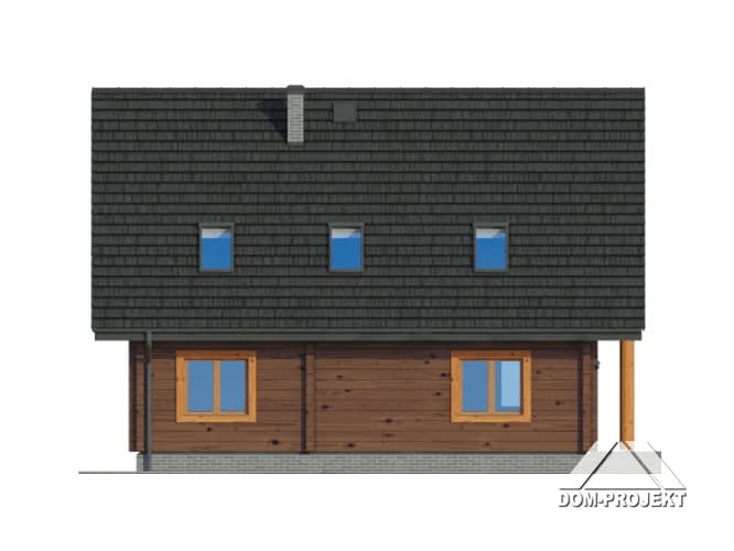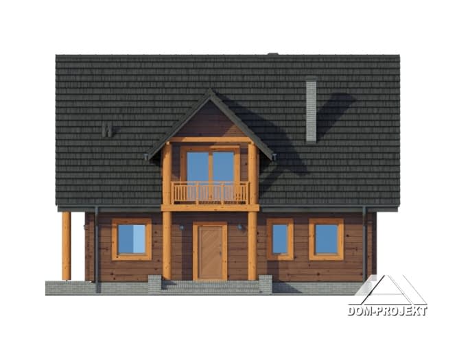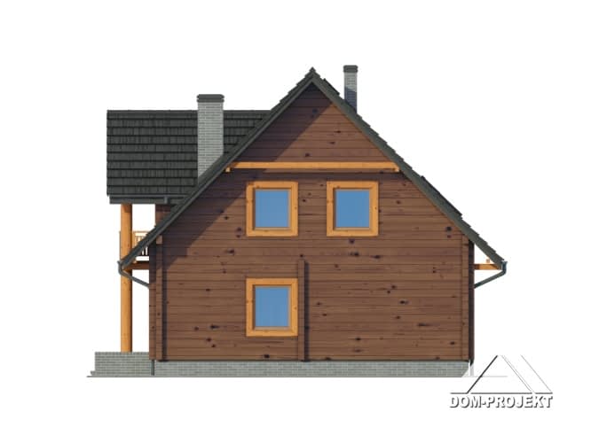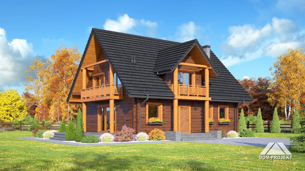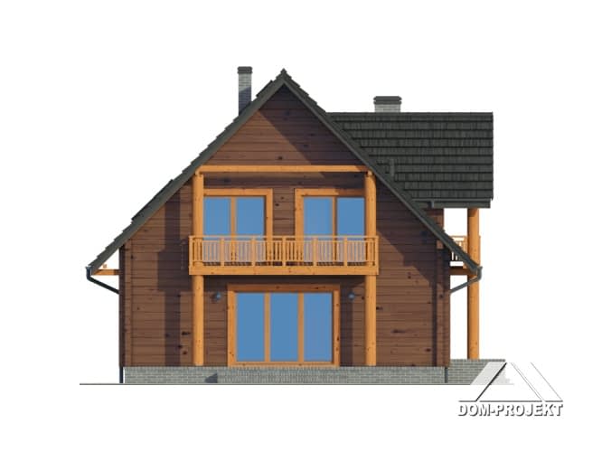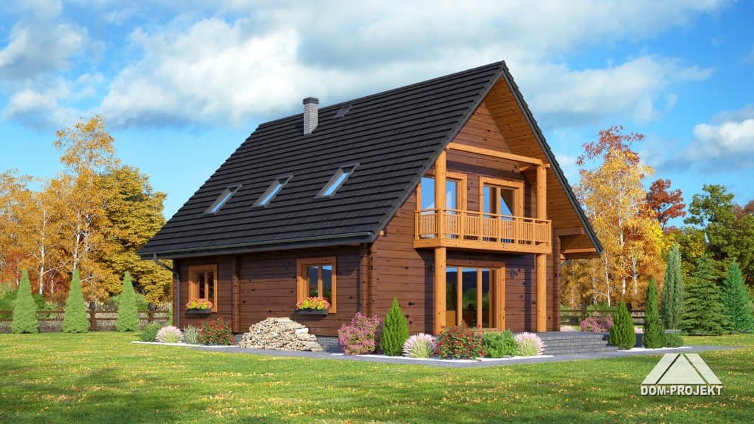 Dom z bali drewnianych. Duży salon z aneksem kuchennym, kominkiem, schodami na poddasze i wyjściem na taras. Pokój, łazienka, korytarz, wiatrołap i kotłownia. Na poddaszu cztery pokoje, łazienka, komunikacja i dwa balkony. Zwarta bryła budynku i dach dwuspadowy sprzyjają szybkiej i taniej budowie i niskim kosztom eksploatacji.Rzuty