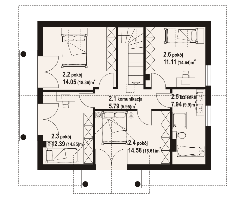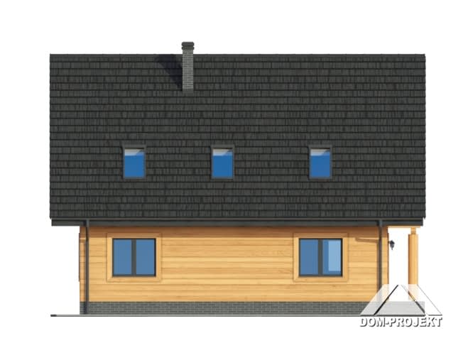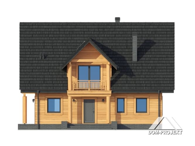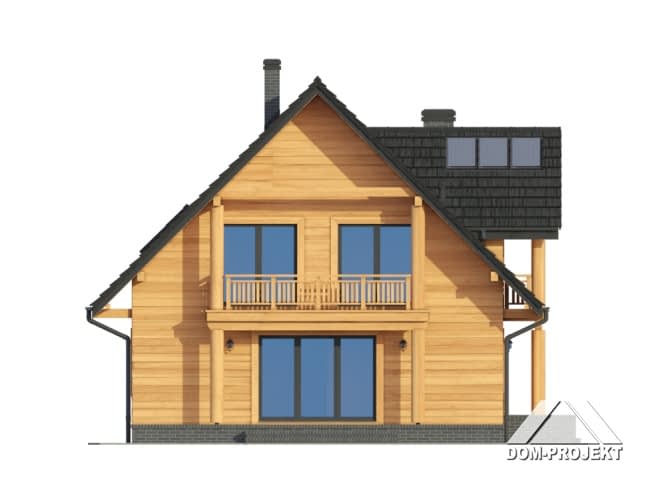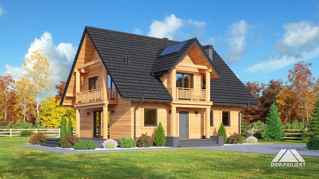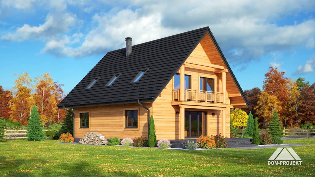 Dom w konstrukcji szkieletu drewnianego. Duży salon z aneksem kuchennym, kominkiem, schodami na poddasze i wyjściem na taras. Pokój, łazienka, korytarz, wiatrołap i kotłownia. Na poddaszu cztery pokoje, łazienka, komunikacja i dwa balkony. Zwarta bryła budynku i dach dwuspadowy sprzyjają szybkiej i taniej budowie i niskim kosztom eksploatacji.Rzuty