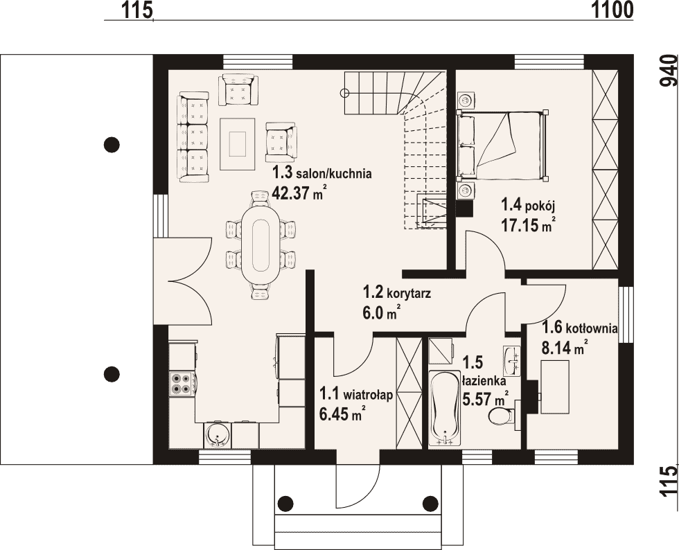 - 1.3 - kuchnia, salon42.37 m²