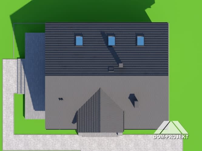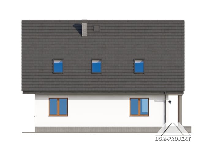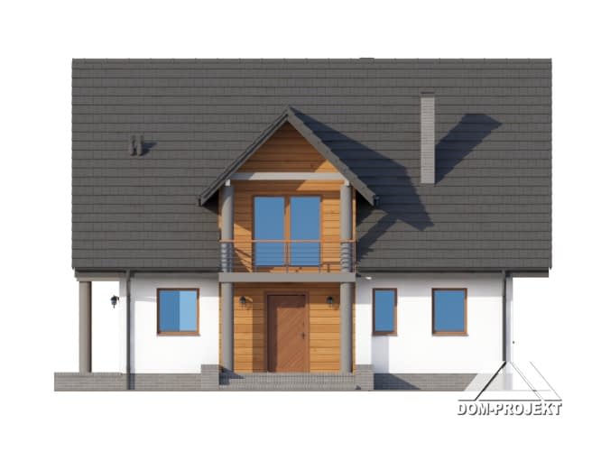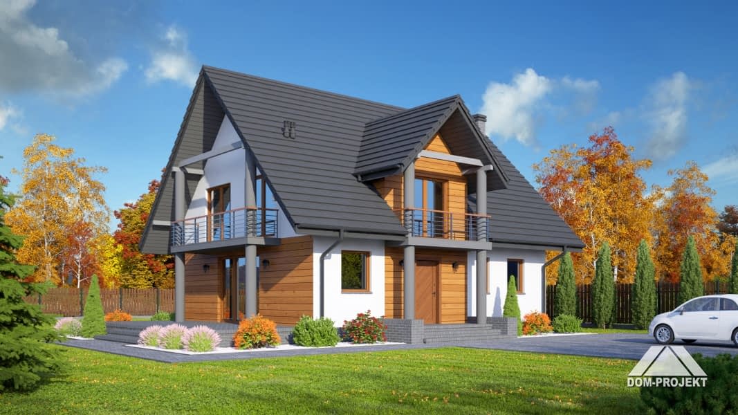 Wygodny dom z poddaszem. Duży salon z aneksem kuchennym, kominkiem, wyjściem na taras i schodami na poddasze. Pokój, łazienka, wiatrołap, kotłownia i korytarz. Na poddaszu cztery pokoje, łazienka, dwa balkony i komunikacja. Zwarta bryła budynku i dach dwuspadowy sprzyjają szybkiej i taniej budowie i niskim kosztom eksploatacji.Rzuty