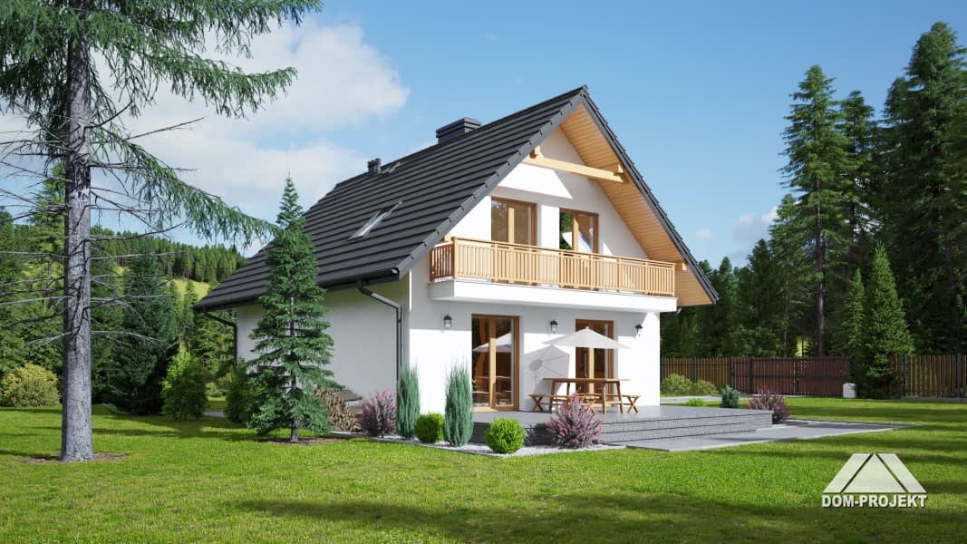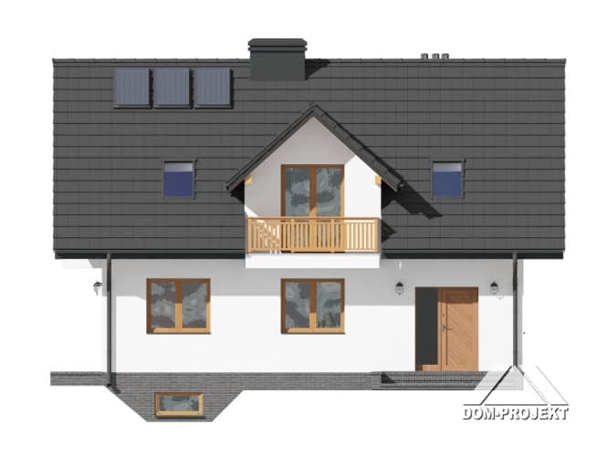 Dom z podpiwniczeniem. Duży salon z aneksem kuchennym, kominkiem, wyjściami na taras i schodami na poddasze. Łazienka, wiatrołap, schody do piwnicy. Na poddaszu trzy pokoje, łazienka, komunikacja i dwa balkony. W piwnicach kotłownia, pralnia i pomieszczenia gospodarcze. Zwarta bryła budynku i dach dwuspadowy sprzyjają szybkiej i taniej budowie i niskim kosztom eksploatacji.Rzuty