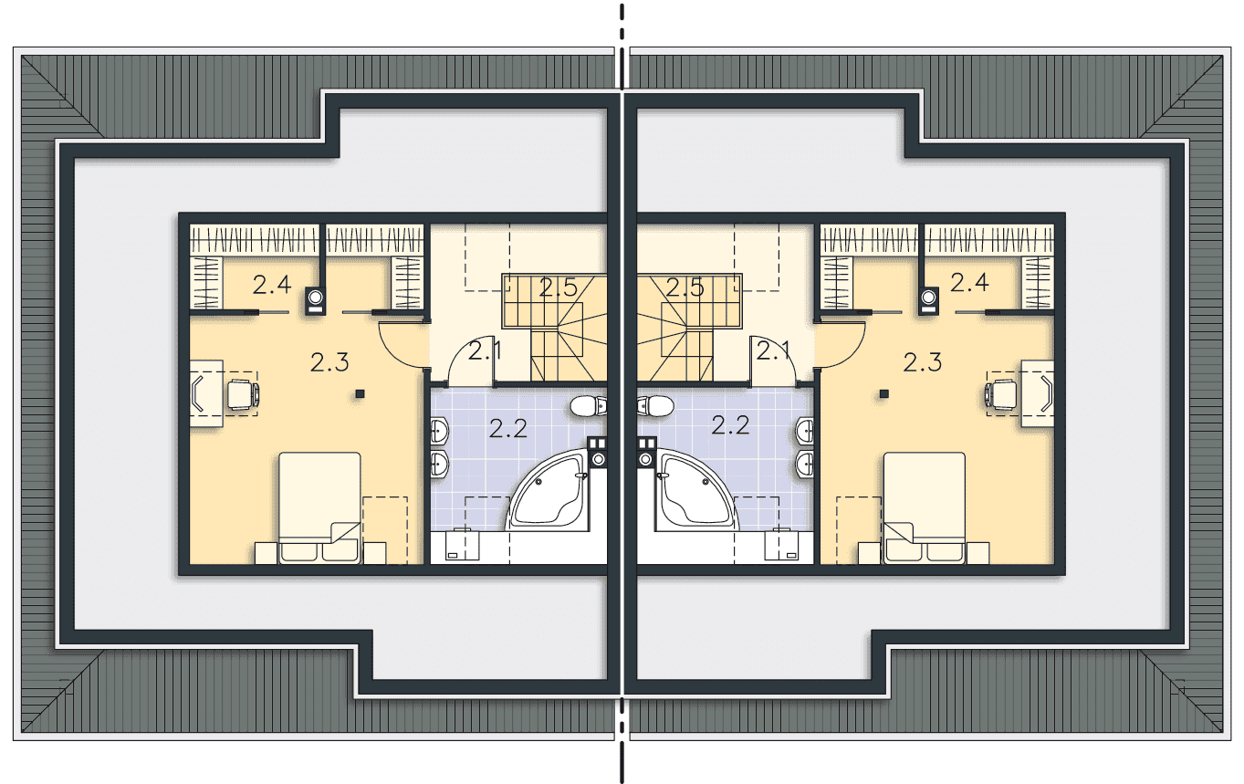 Oba segmenty domu przykrywa dach czterospadowy o łagodnym spadku nadając prostej bryle bliźniaka horyzontalny charakter. Narożniki budynku zaakcentowane są wcięciami, w które wnikają tarasy: wejściowy i ogrodowy. Dach budynku nad nimi wspierają murowane słupy. Dodaje to formie odrobinę ażurowości. Elewacje uzupełniają drewniane elementy okładziny ściany tarasu ogrodowego i kwietniki pod oknami. Na parterze, zaraz za wiatrołapem ma miejsce pokój dzienny z kominkiem, aneksem jadalnym i niewielką, otwartą kuchnią. Znajdują się tu również dwie sypialnie, łazienka, kotłownia, wnęki na szafy oraz schody na poddasze, gdzie zlokalizowano sypialnię z łazienką i garderobą.