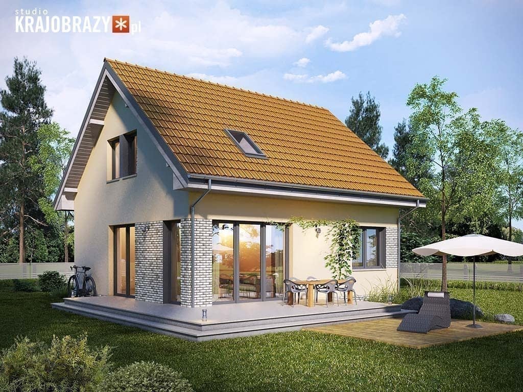 Sempre - projekt małego domu z poddaszem bez garażu o powierzchni do 100m2. Posiada on ekonomiczny dach dwuspadowy i prostą, tanią w budowie bryłę budynku. Z tyłu i boku budynku znalazły się duże okna z wyjściem na narożny taras.Parter podzielono na strefę dzienną, czyli salon z jadalnią i otwartą częścią kuchenną, dodatkowy pokój oraz część techniczną mieszczącą wc, spiżarnię oraz pomieszczenie gospodarcze. Na piętrze ulokowano trzy pokoje sypialne oraz łazienkę, a cały schemat funkcjonalny domu mieści sie na powierzchni do 100m2. Dokumentację zamówić można również w wariancie lustrzanego odbicia.Rzuty