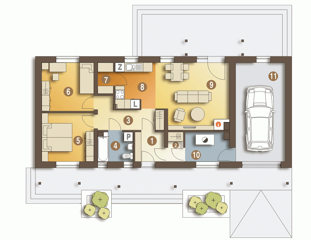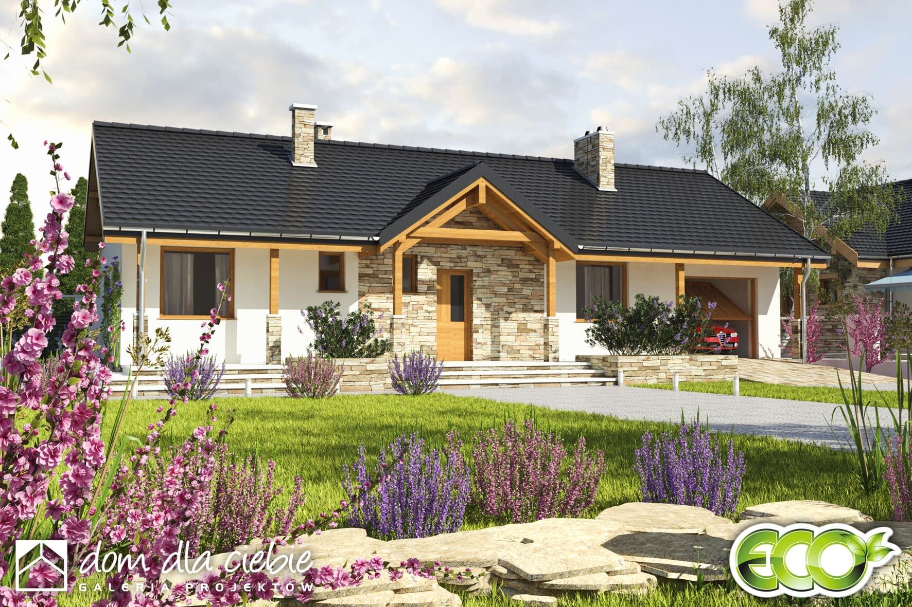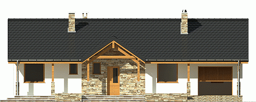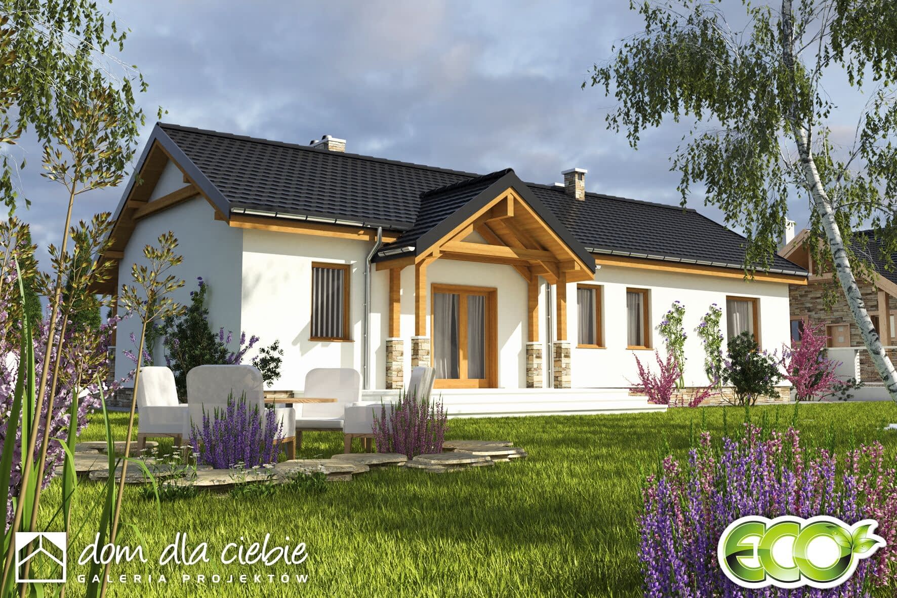 Projekt domu jednorodzinnego Siewka to propozycja dla 2-3 osobowej rodziny.Mały, ekonomiczny domek prezentuje przemyślaną funkcję. Na niewielkiej powierzchni mieszkalnej przewidziano dwie identyczne sypialnie, salon z kominkiem i wyjściem na taras oraz kuchnię za spiżarnią. W bryle budynku zawarto również łazienkę, garderobę, wygodny rozprowadzający hol oraz wiatrołap, z którego dostępne jest pomieszczenie kotłowni z piecem na paliwo stałe a dalej garaż. Siewka jest wąskim domem z dachem dwuspadowym i zwartej prostokątnej bryle. Ten mały domek z pewnością będzie tani w eksploatacji i budowie.