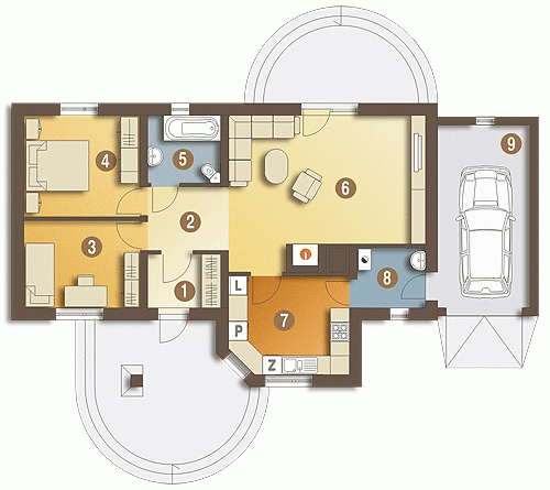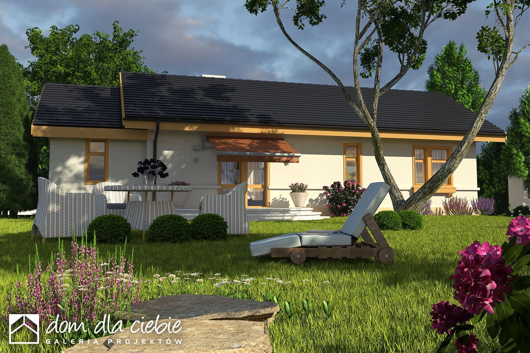 Skowronek to dom parterowy przeznaczony dla 2-3 osobowej rodziny o ciekawej, przyjaznej architekturze i prostej funkcji. Na jednym poziomie zaprojektowano dwie wygodne sypialnie, łazienkę, oraz przestronny salon z kominkiem. Z garażu można przejść bezpośrednio do kuchni poprzez pomieszczenie techniczne z piecem CO. Skowronek może z powodzeniem służyć jako domek letniskowy. Projekt dostępny również w wersji bez garażu.