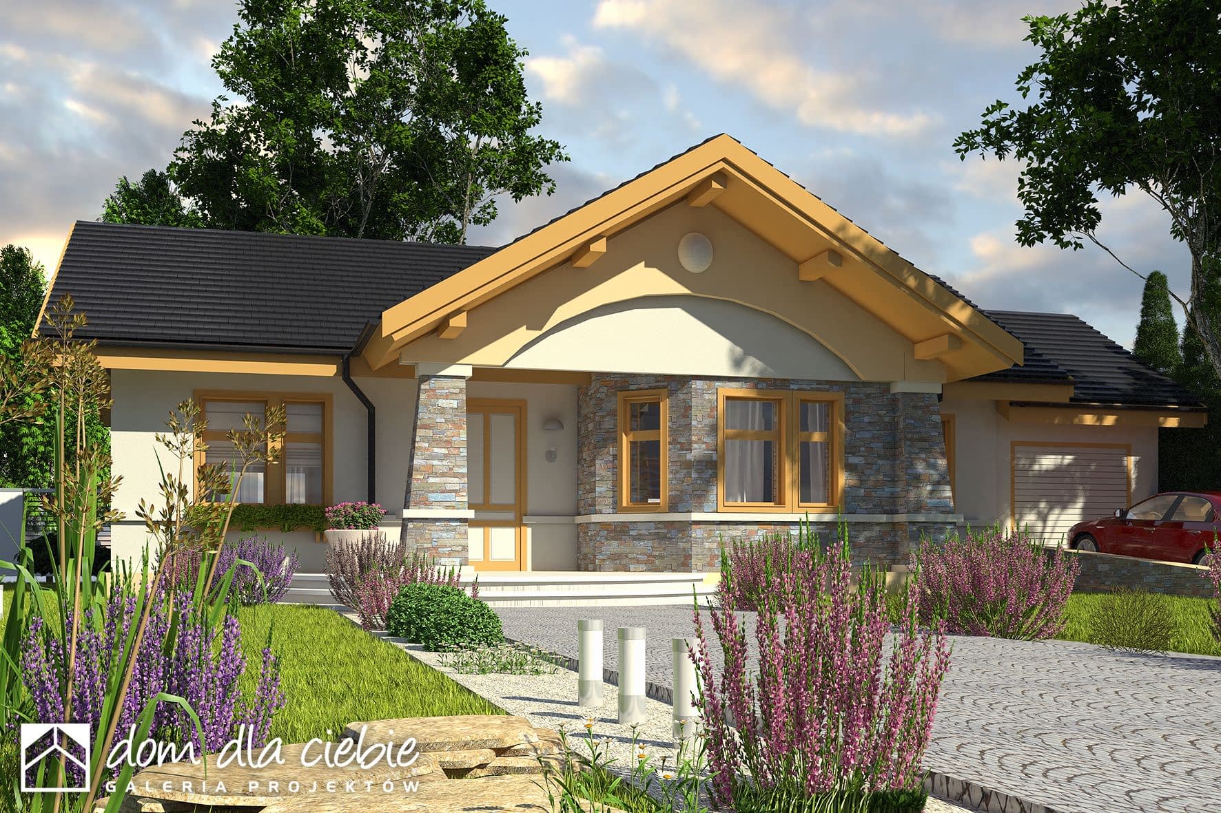 elewacje: tynk akrylowy, okładzina kamienna