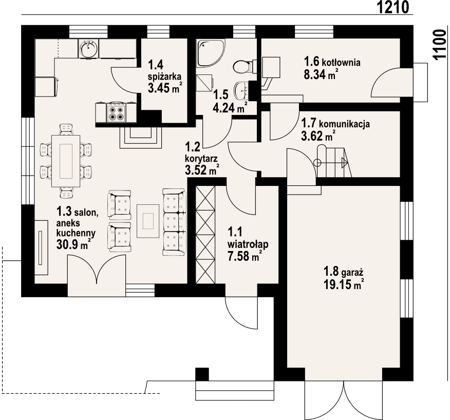 - 1.3 - salon z aneksem kuchennym30.9 m²