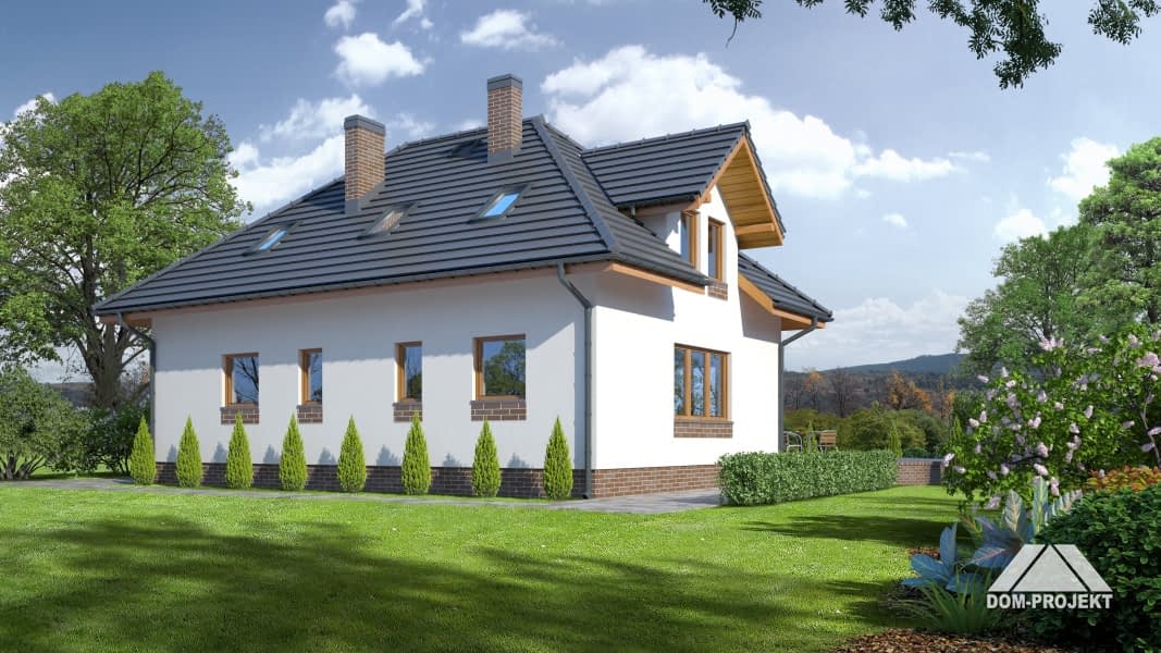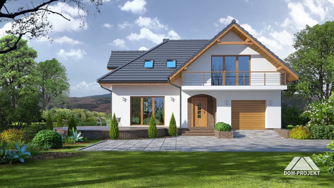 Dom z wejściem i wjazdem od południa. Pięć pokoi, trzy łazienki, garaż, kotłownia, spiżarka. Wygodny układ funkcjonalny. Część dzienna na parterze, część nocna na poddaszu. Na parterze duży salon z kominkiem, aneksem kuchennym, wyjściem na taras i do ogrodu. Wygodny wiatrołap z miejscem na szafy, łazienka, kotłownia, garaż. Na poddaszu duża sypialnia z własną łazienką, szafami wbudowanymi i balkonem. Trzy inne sypialnie, łazienka, schowek i komunikacja.Rzuty