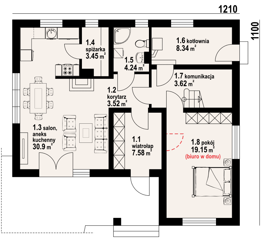 - 1.3 - salon z aneksem kuchennym30.9 m²