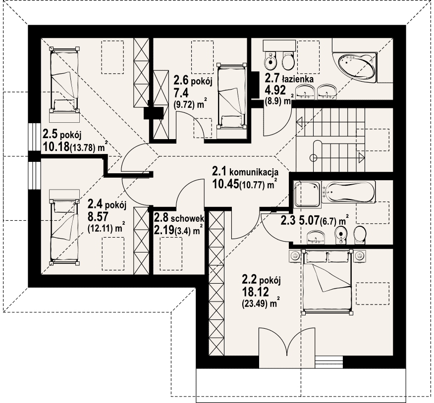 Wygodny układ funkcjonalny. Na parterze duży salon z kominkiem, aneksem kuchennym, wyjściem na taras i do ogrodu. Wygodny wiatrołap z miejscem na szafy, łazienka, kotłownia. Duży, wygodny pokój mieszkalny, który można wykorzystać jako biuro w domu.Na poddaszu duża małżeńska sypialnia z własną łazienką, szafami wbudowanymi i balkonem. Trzy inne sypialnie, łazienka, schowek i komunikacja.Rzuty