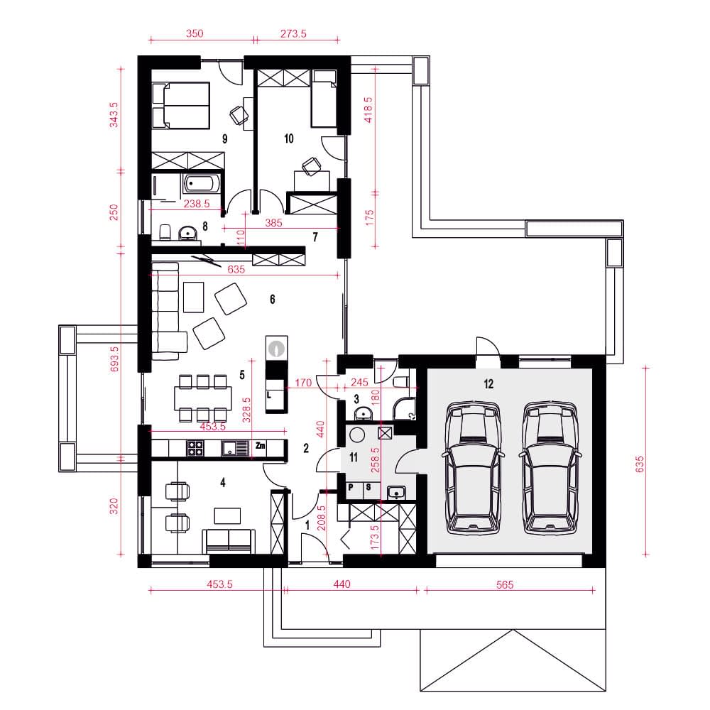 - Minimalne wymiary działki25.6 x 23.1m