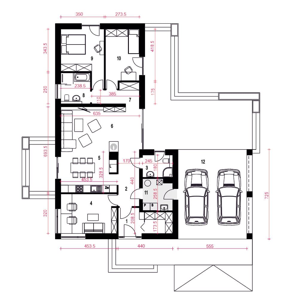 Słoneczna to nowoczesny dom dla 3-4 osobowej rodziny, z tradycyjnymi murowanymi ścianami i prefabrykowanymi, drewnianymi wiązarami dachowymi. Bryła budynku tworzy literę L. Wejście od frontu prowadzi do wiatrołapu z garderobą, a następnie do holu. Pokój-gabinet, mała łazienka, pomieszczenie techniczne i kuchnia z jadalnią i salonem są dostępne z holu. Część prywatna obejmuje dwie sypialnie i dużą łazienkę. Strefa dziennej przestrzeni jest otwarta po dach, a z jadalni i salonu można bezpośrednio wyjść na tarasy, łącząc wnętrze z otoczeniem. Pomieszczenie techniczne prowadzi pod wiatę, a mała łazienka z drzwiami tarasowymi umożliwia korzystanie z niej w letnie dni. Elewacja w minimalistycznym stylu łączy drewno z antracytowymi wstawkami, a ciemnoszary dach nadaje domowi charakteru. Słoneczna spełnia nowoczesne potrzeby życia, otaczając mieszkańców przytulnym ogrodowym dziedzińcem.