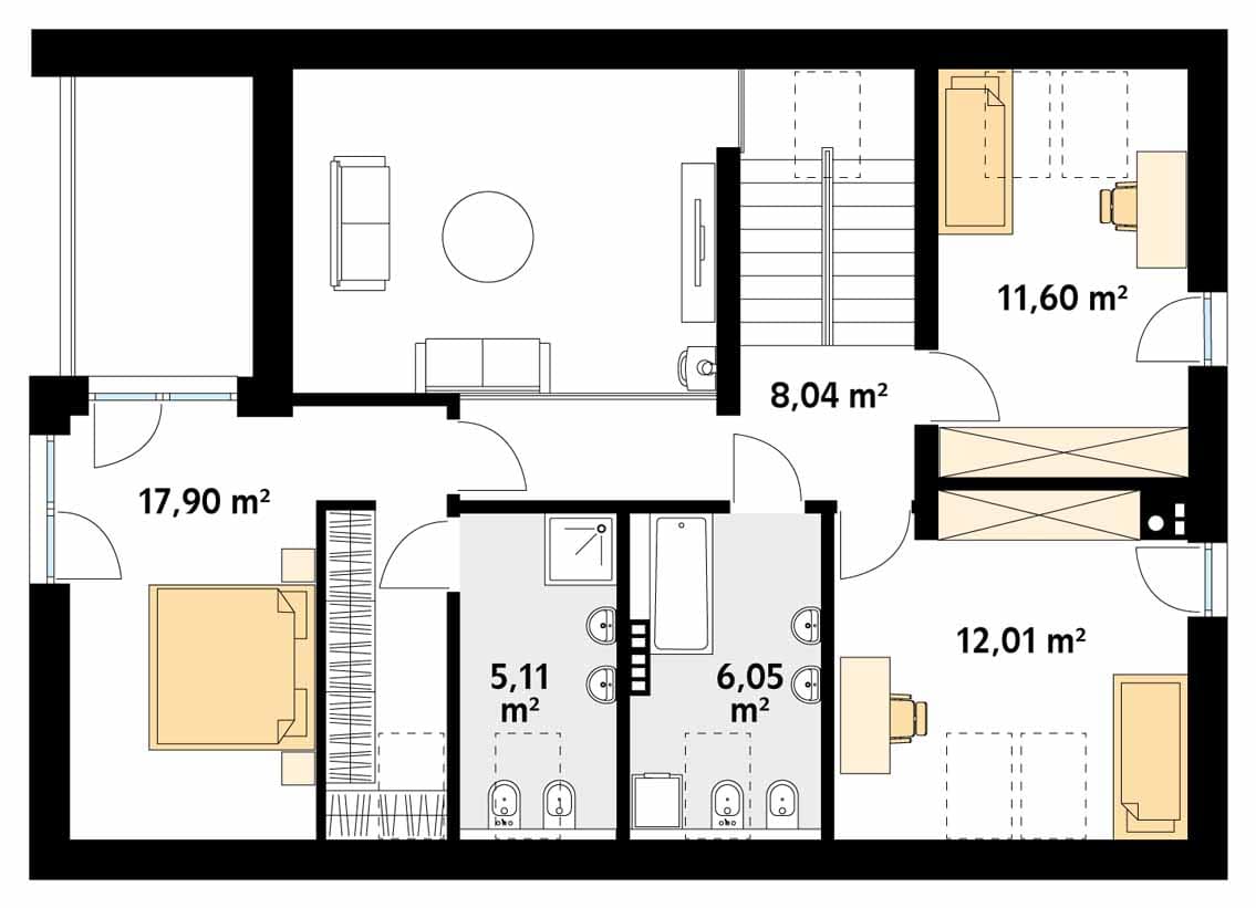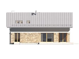 Słoneczny 2 to projekt domu z użytkowym poddaszem bez garażu. Układ funkcjonalny domu podzielono pomiędzy dwie kondygnacje. Na parterze znalazła się część dzienna. Tworzą ją przestronny salon, jadalnia z wyjściem na taras oraz kuchnia, w której wygospodarowano miejsce na wyspę. Przy kuchni pojawiła się praktyczna spiżarnia. Układ funkcjonalny parteru dopełnia dodatkowy pokój, łazienka oraz duża kotłownia. Na poddaszu zaproponowano trzy wygodne sypialnie oraz rodzinną łazienkę. Jedna z sypialni zaprojektowana została jako apartament gospodarzy z prywatną łazienką i garderobą. Niewątpliwym atutem projektu jest zadaszony taras, dostępny zarówno z salonu, jak i jadalni oraz otwarta część dzienna z licznymi przeszkleniami i antresolą.Konstrukcja