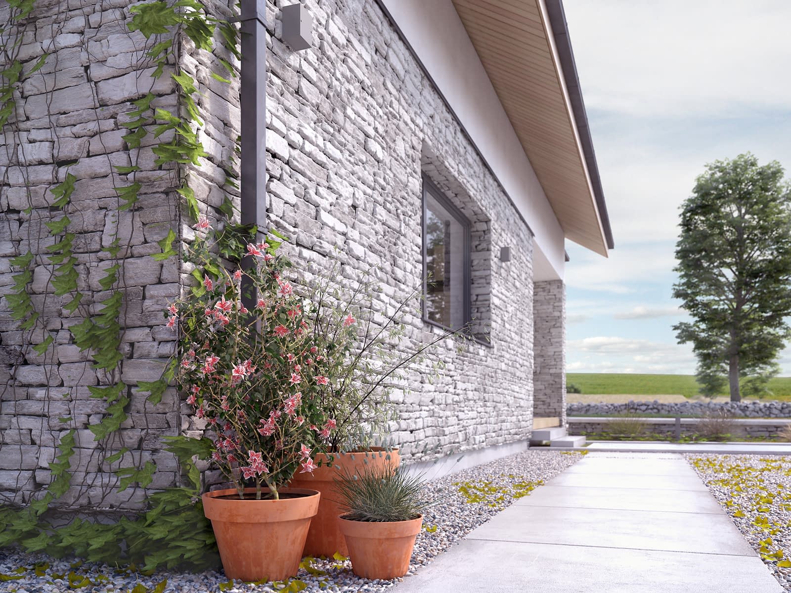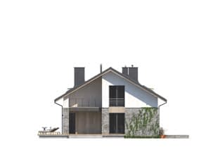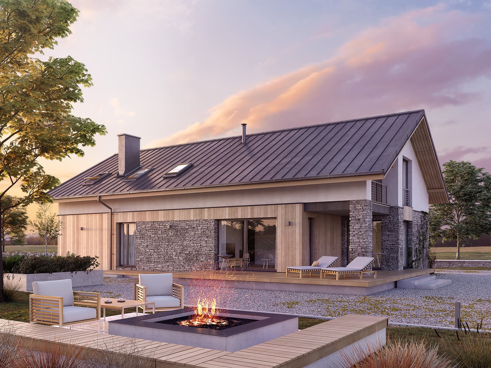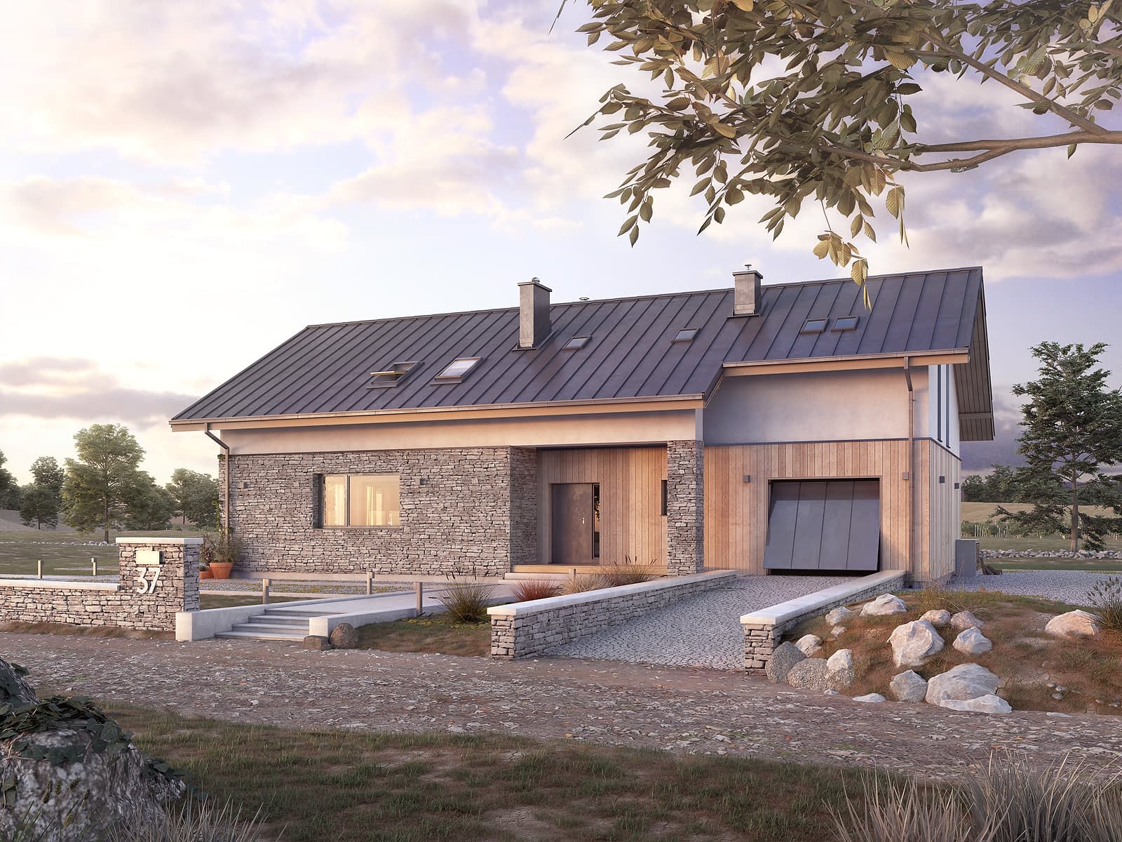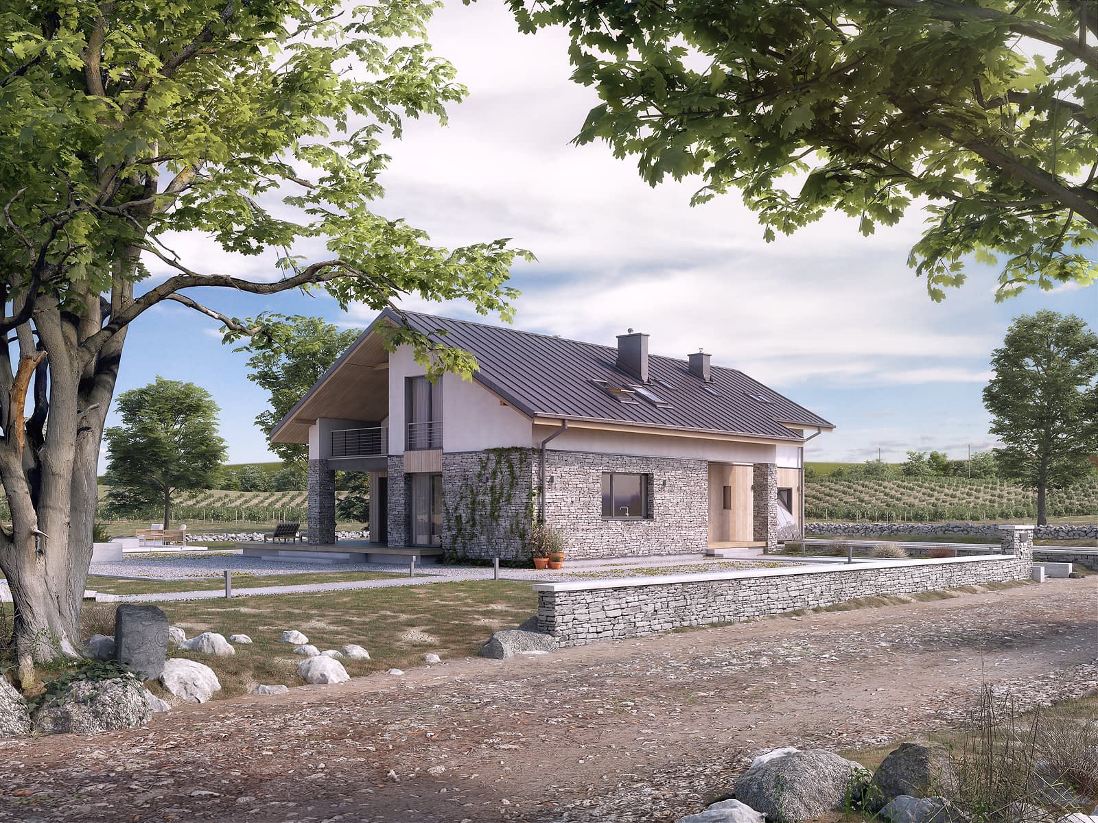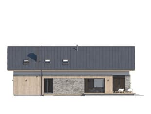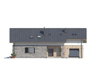 Słoneczny to projekt domu przeznaczony dla 4 - 5-osobowej rodziny. Głównym pomieszczeniem budynku jest dwukondygnacyjny salon z antresolą. Takie rozwiązanie, w połączeniu z dużymi przeszkleniami w części dziennej, tworzy przestronną, jasną i otwartą przestrzeń oraz daje duże możliwości aranżacyjne. W otwartej na salon i jadalnię kuchni przewidziano wyspę i praktyczną spiżarnię. Układ funkcjonalny parteru dopełnia dodatkowy pokój, który idealnie sprawdzi się jako gabinet do pracy lub pokój gościnny. Strefa prywatna zlokalizowana na poddaszu zapewnia mieszkańcom wygodę i poczucie prywatności, a dzięki antresoli otwierającej ją na część dzienną, sprzyja rodzinnej atmosferze. Główna sypialnia posiada dostęp do prywatnej łazienki, garderoby i balkonu. Dzięki rozbudowanemu programowi użytkowemu w domu nie zabrakło również powierzchni gospodarczej. W projekcie przewidziano garderobę i spiżarnię na parterze oraz pralnię i ogólnodostępną garderobę na poddaszu. Projekt posiada prostą bryłę z tradycyjnym dwuspadowym dachem. Wykorzystanie na elewacji naturalnych materiałów tworzy przytulną domową atmosferę. Wejście główne oraz taras posiada zadaszenie, co jest niewątpliwie dodatkowym atutem projektu. Kotłownia usytuowana w narożniku budynku daje możliwość wykonania dodatkowych drzwi zewnętrznychKonstrukcja