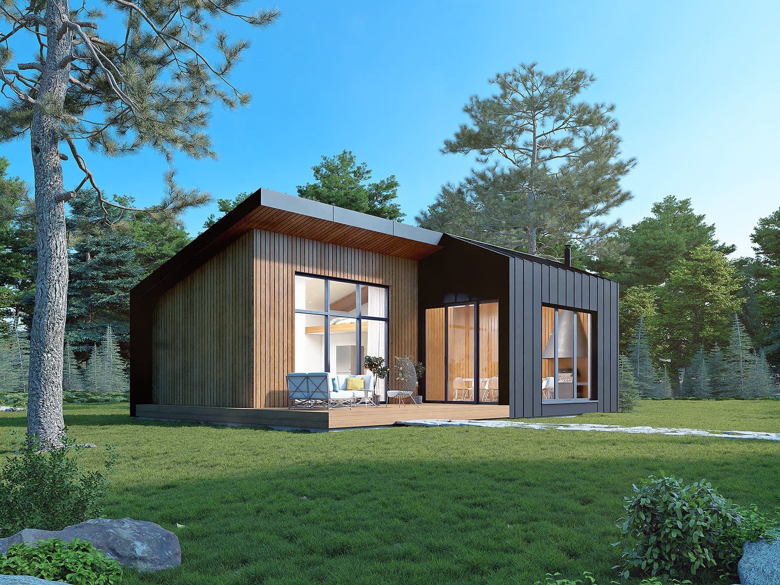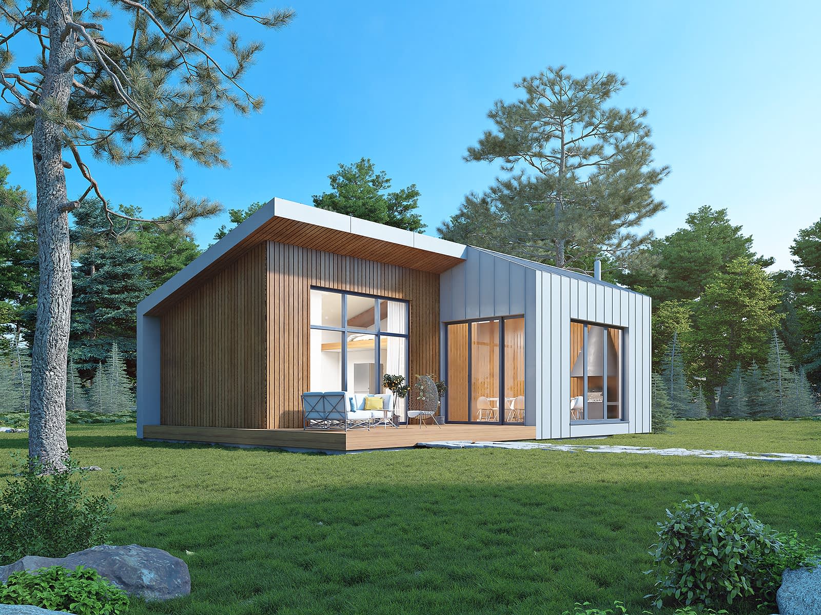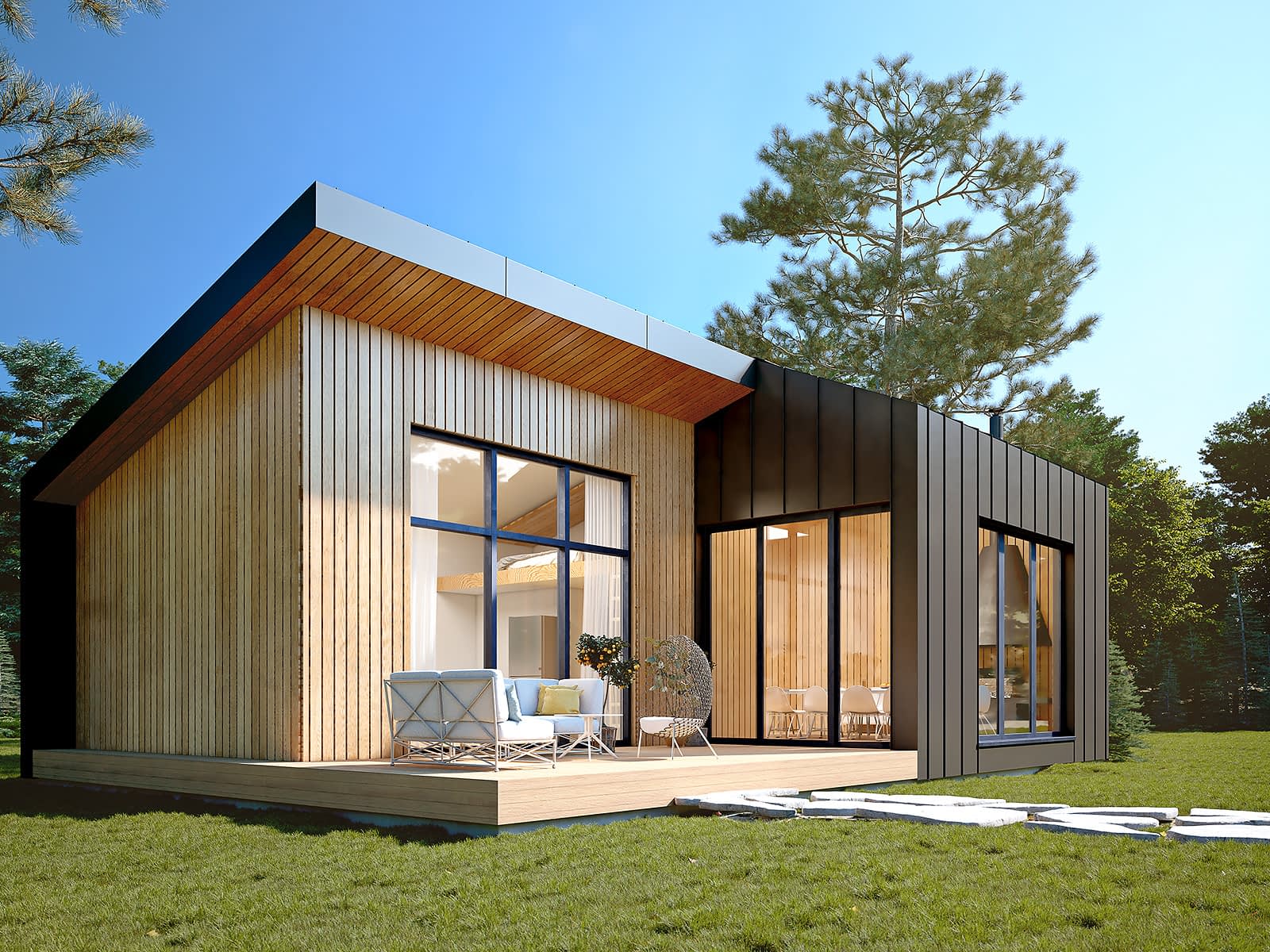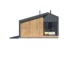 Ściany: drewniane, szkieletowe, Stropy: drewniane, Dach: blacha na rąbek, 16 i 23 stopnieRzuty