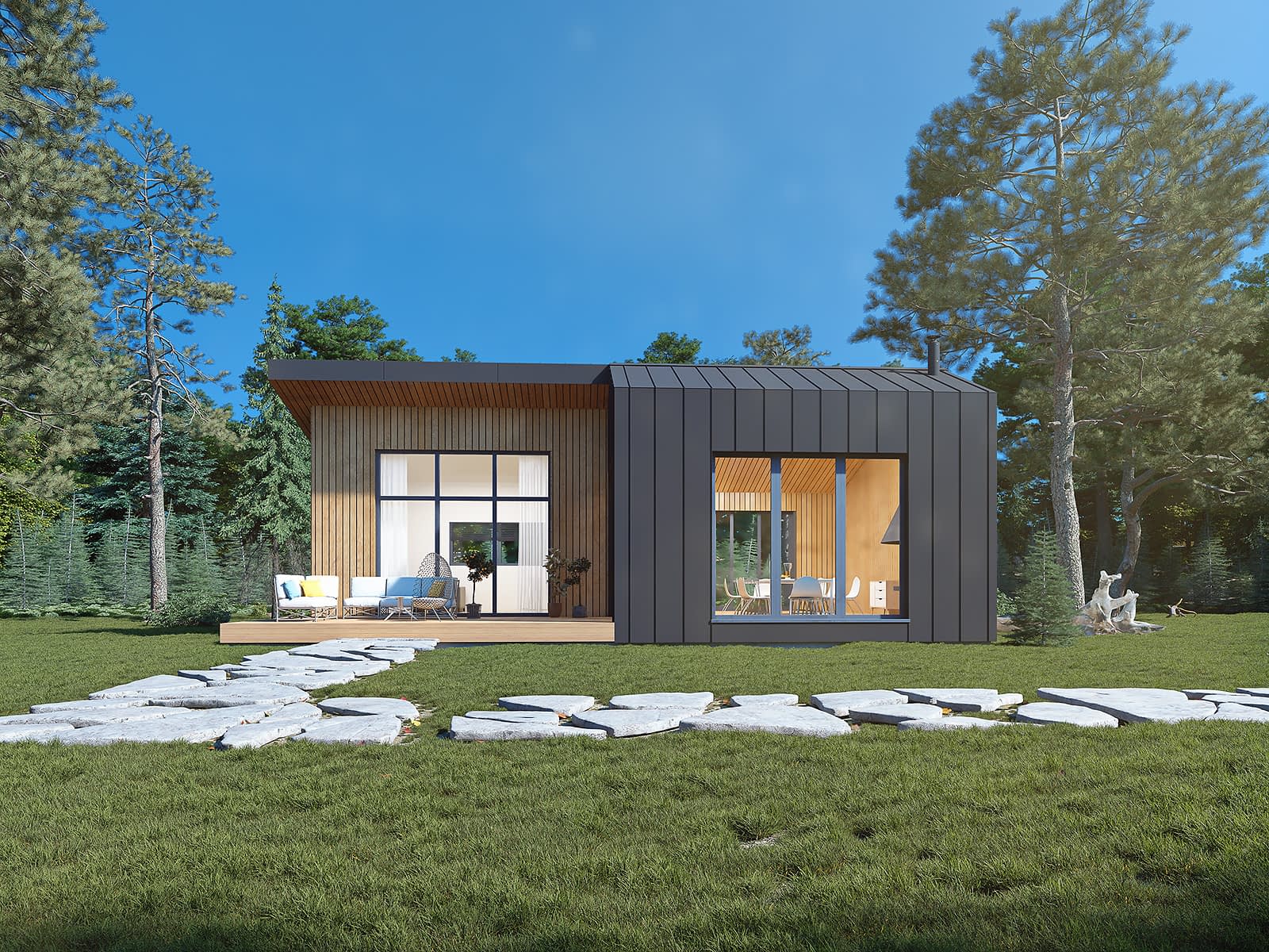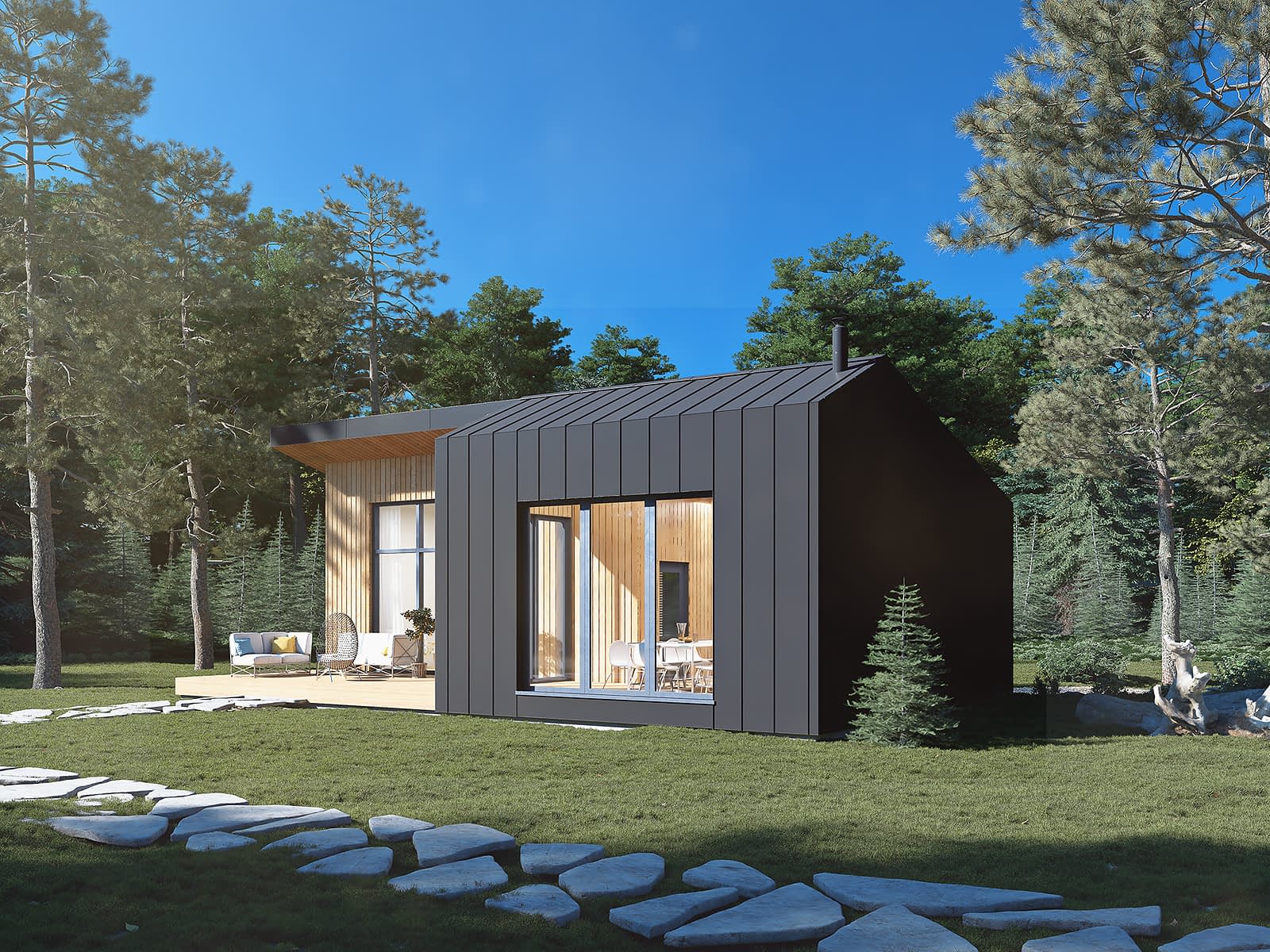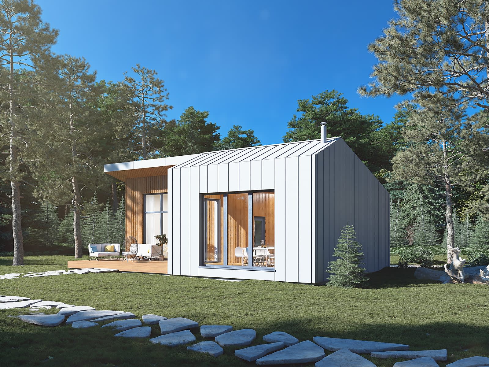 Ściany: drewniane, szkieletowe, Stropy: drewniane, Dach: blacha na rąbek, 16 i 23 stopnieRzuty