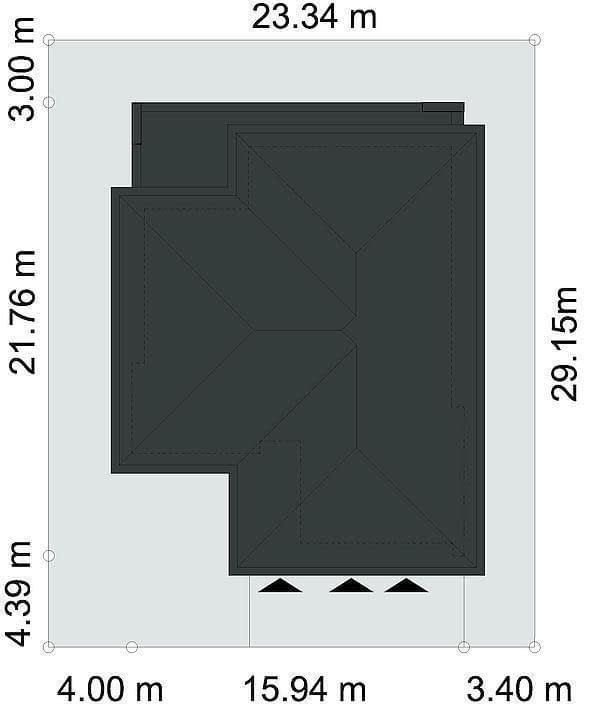 Świetnie rozplanowany układ funkcjonalny to duży salon, w którym zaprojektowano miejsce na dużą narożna kanapę, kominek oraz stół. Salon posiada wyjście na taras zewnętrzny, na którym przewidziano miejsce na meble ogrodowe i stół. Kuchnię z wyspą usytuowano od strony frontu budynku z widokiem na wejście do budynku. Obok kuchni znajduje się spiżarnia. W wiatrołapie zaprojektowano dużą szafę oraz miejsce na ławeczke/pufę do zmiany obuwia. Z wiatrołapu przechodzi się do pomieszczenia technicznego/kotłowni oraz dwustanowiskowego garażu. Garaż przeznaczony jest na dwa samochody, wygospodarowno dodatkowe miejsce jako przestrzeń do przechowywania. W stefie dziennej zaprojektowano również łazienkę z prysznicem.