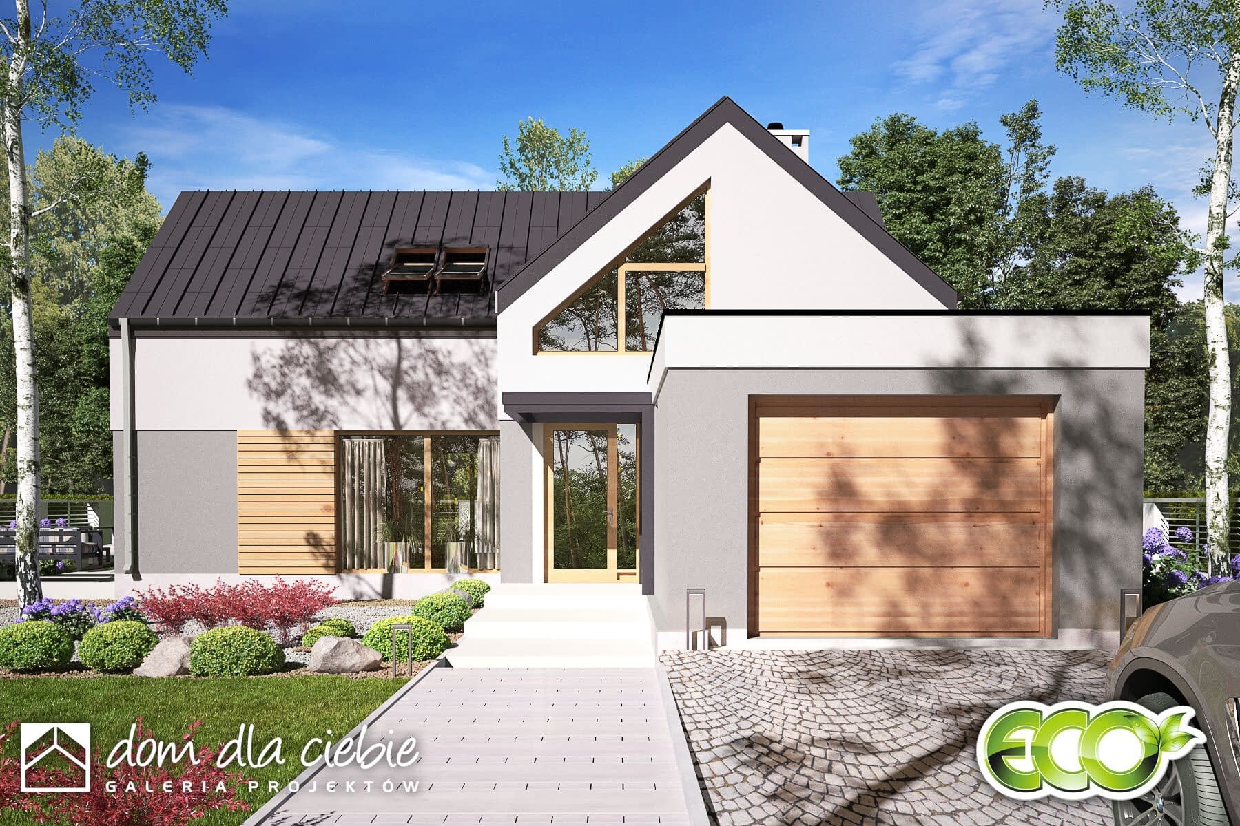 Sobota A1 to nowoczesny domu jednorodzinny z poddaszem użytkowym, dwukondygnacyjny i prosty dom z jętkową konstrukcją dachu, z garażem jednostanowiskowym. Projekt jest dobrym rozwiązaniem na działki z wjazdem od strony południowej. Na parterze mieści się strefa dzienna - salon z jadalnią i otwartą kuchnią. Nad częścią salonu zaprojektowano antresolę. W wiatrołapie przewidziano miejsce na garderobę. Z holu możemy dostać się na schody, do WC oraz pomieszczenia technicznego z piecem CO a także do dwuosobowej sypialni z indywidualną łazienką. Na piętrze znajdują się dwie pojedyncze sypialnie z garderobami oraz duża łazienka. Z górnego holu, dzięki antresoli, można zajrzeć do salonu.Projekt Sobota to dobre ekonomiczne rozwiązanie o nowoczesnej, bezokapowej formie.Zewnętrzna elewacja cechuje się delikatnym detalem i naturalną kolorystyką.