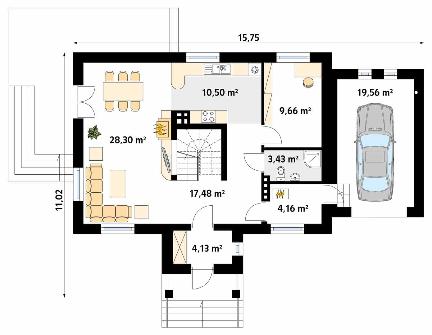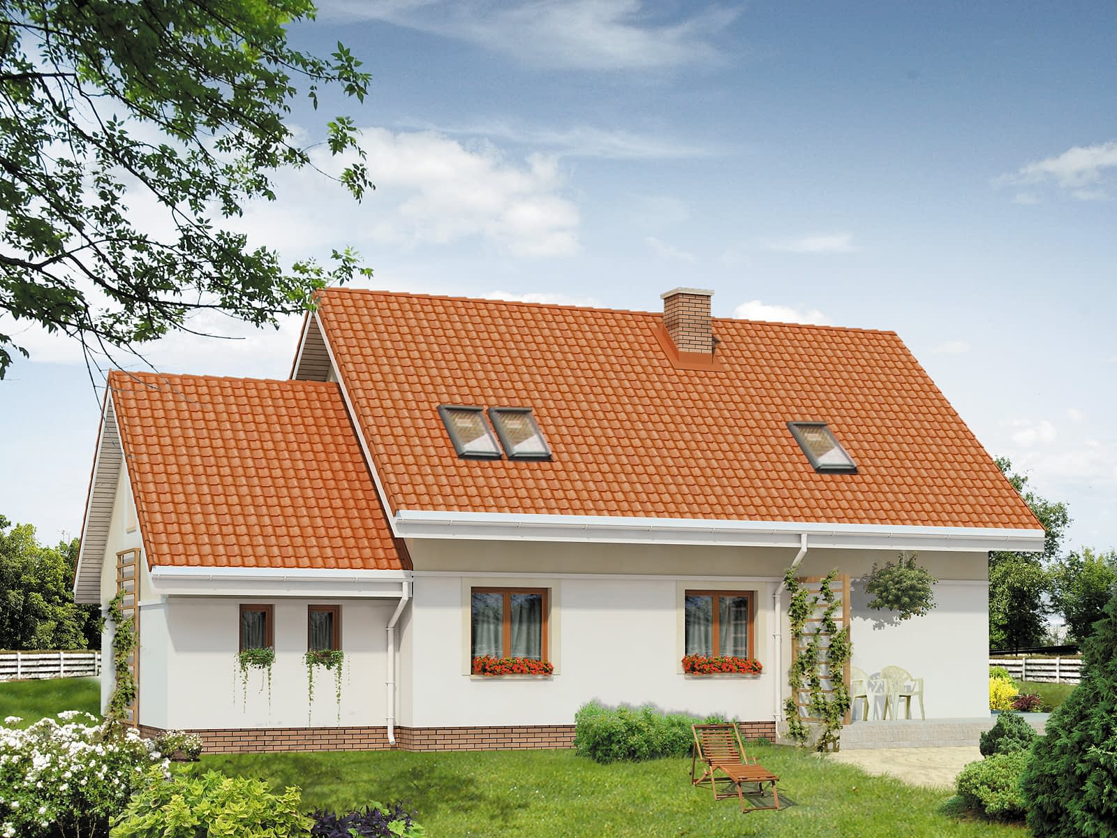 Dom jednorodzinny z użytkowym poddaszem, dla 4 – 5-osobowej rodziny z garażem jednostanowiskowym. Wyraźny podział na strefę nocną i dzienną. Praktyczny układ funkcjonalny.Konstrukcja
