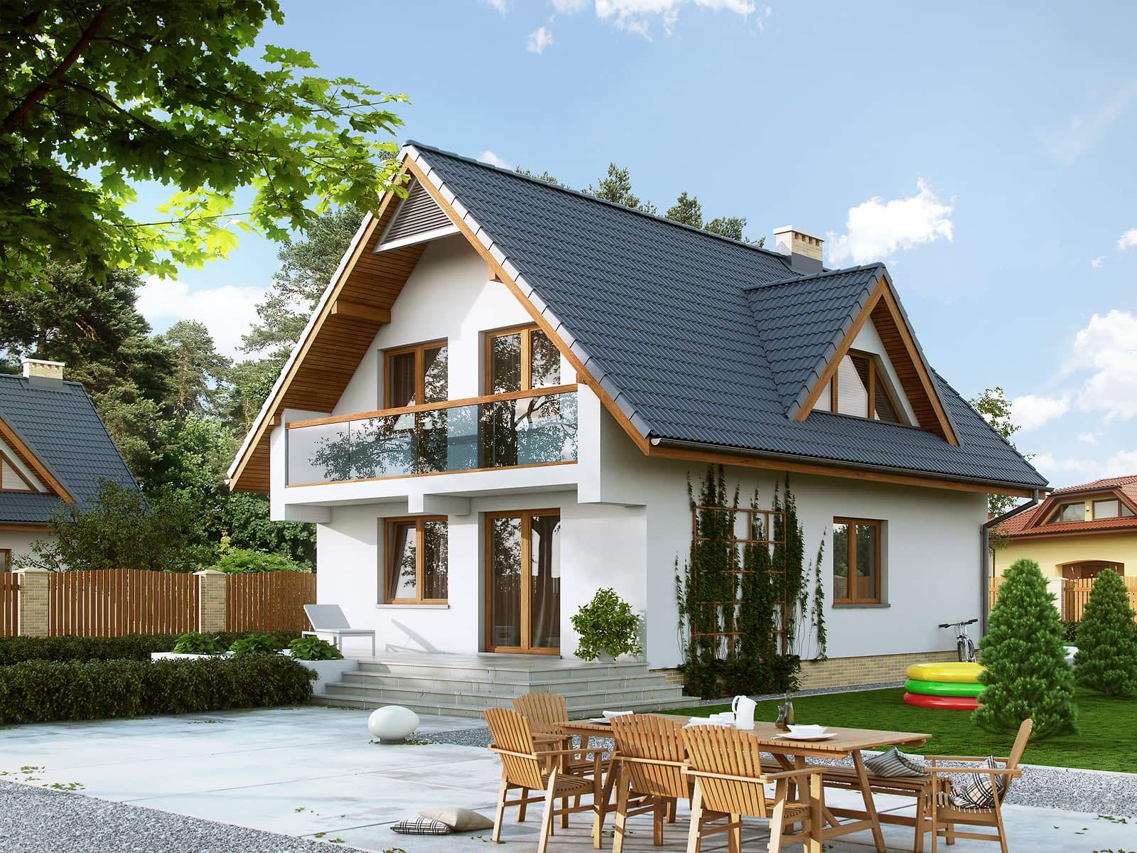 Dom jednorodzinny, parterowy z użytkowym poddaszem, niepodpiwniczony. Niewielki dom o zwartej bryle i racjonalnym układzie wewnętrznym. Na parterze kuchnia z jadalnią, pokój dzienny z kominkiem. Na poddaszu wygodna łazienka i sypialnie. Nad garażem strych lub pracownia.Konstrukcja