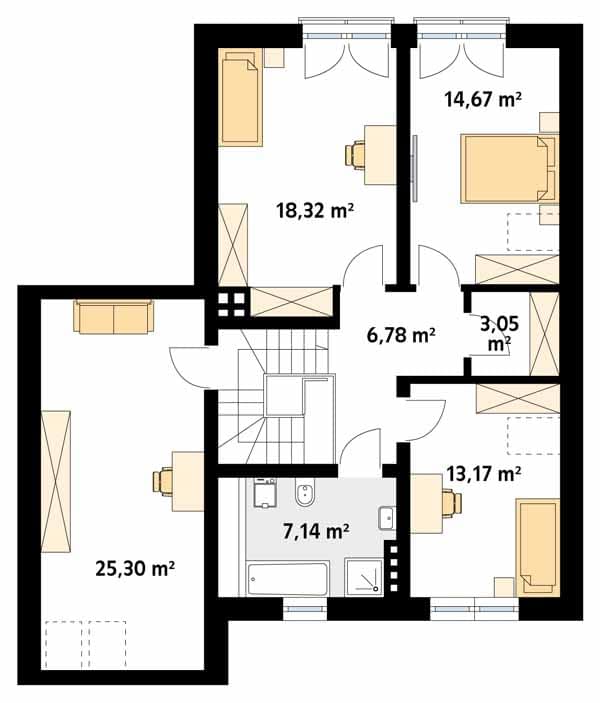 Sopran 6 to propozycja domu z użytkowym poddaszem i jednostanowiskowym garażem wkomponowanym w bryłę budynku. Atutem projektu jest obszerny, zadaszony taras dostępny z salonu oraz duża kotłownia posiadająca niezależne wejście na zewnątrz. Układ funkcjonalny został podzielony na trzy strefy użytkowe. Na parterze zaprojektowano strefę dzienną i gospodarczą. Część dzienną tworzą: przestronny salon, kuchnia ze spiżarnią oraz jadalnia, w której bez problemu zmieści się duży stół z krzesłami. Część gospodarcza to jednostanowiskowy garaż i kotłownia. Na poddaszu ulokowano część nocną, na którą składają się trzy sypialnie, rodzinna łazienka oraz garderoba. Autor projektu wygospodarował również dodatkowy pokój na półpiętrze nad garażem, który może pełnić funkcję dodatkowej sypialni lub pokoju do pracy. Projekt domu Sopran 6 będzie idealnym wyborem dla 4-5 osobowej rodziny.Konstrukcja