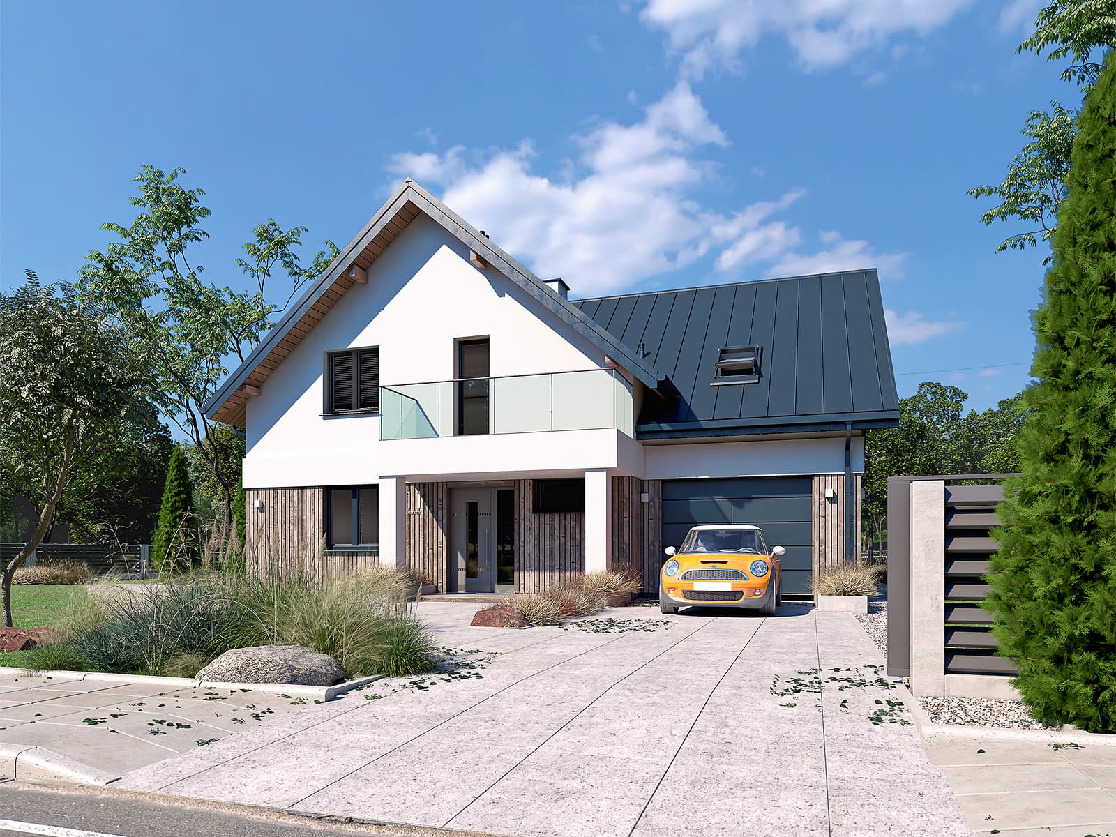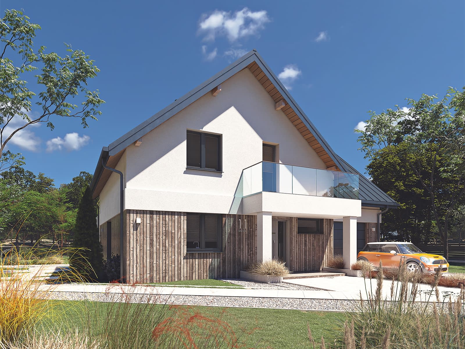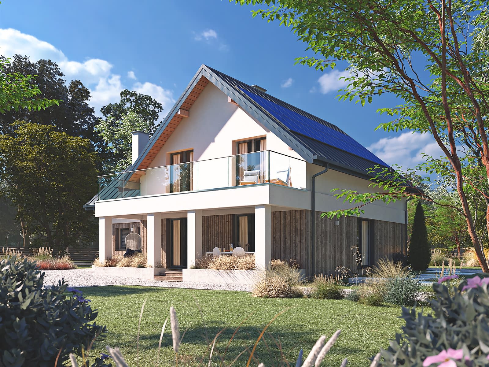 Sopran 8 to projekt domu z użytkowym poddaszem i jednostanowiskowym garażem w bryle budynku. Jest to tradycyjny projekt domu, w którym główna kalenica zwrócona jest prostopadle do frontowej krawędzi działki. W bryle budynku znajduje się garaż nad którym znajduje się duże pomieszczenie mogące służyć np jako sypialnia. Bryła budynku została zaprojektowana w nowoczesnym stylu, dzięki połączeniu drobnej szalówki, szarości oraz bieli.Konstrukcja