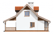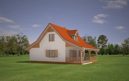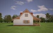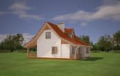 Projekt domu Sosenka 5 to kolejna odsłona projektu z popularnej serii Sosenek z pracowni MG Projekt. Projekt domu Sosenka 5 zaprojektowano dla 3-4 osobowej rodziny, do wykorzystania jako całoroczny dom jednorodzinny. Budynek może też służyć jako letniskowy. Biorąc pod uwagę uzyskaną powierzchnię projekt jest prosty i niedrogi w realizacji. Bryła w projekcie domu Sosenka 5 składa się z zasadniczej części z poddaszem użytkowym, przykrytej dwuspadowym symetrycznym dachem, oraz dwóch dobudówek. Frontowej - mieszczącej pokój na parterze i werandę wejściową, oraz tylnej z dużym zadaszonym tarasem. Zadaszony taras to świetne rozwiązanie powiększające optycznie pokój dzienny. Dach budynku ozdobiono dwiema niewielkimi lukarnami - po jednej na każdej połaci. Wewnątrz, na parterze zaprojektowano przestronny salon z wyeksponowanymi schodami i kominkiem, kuchnię, łazienkę, dodatkowy pokój - na przykład sypialnię dla gości, oraz sień i kotłownię. Na poddaszu zaplanowano dwie sypialnie i toaletę. W domu Sosenka 5 zaprojektowano ogrzewanie centralne z pieca w kotłowni. Pracownia posiada wersję odbicia lustrzanego projektu oraz inne odsłony: tańsza w wykonaniu (projekt domu Sosenka), z tarasem na froncie domu (projekt domu Sosenka 2 ), z innym układem pomieszczeń (projekt domu Sosenka 3), w technologii drewnianej z bocznym tarasem i balkonem (projekt domu Sosenka 4).