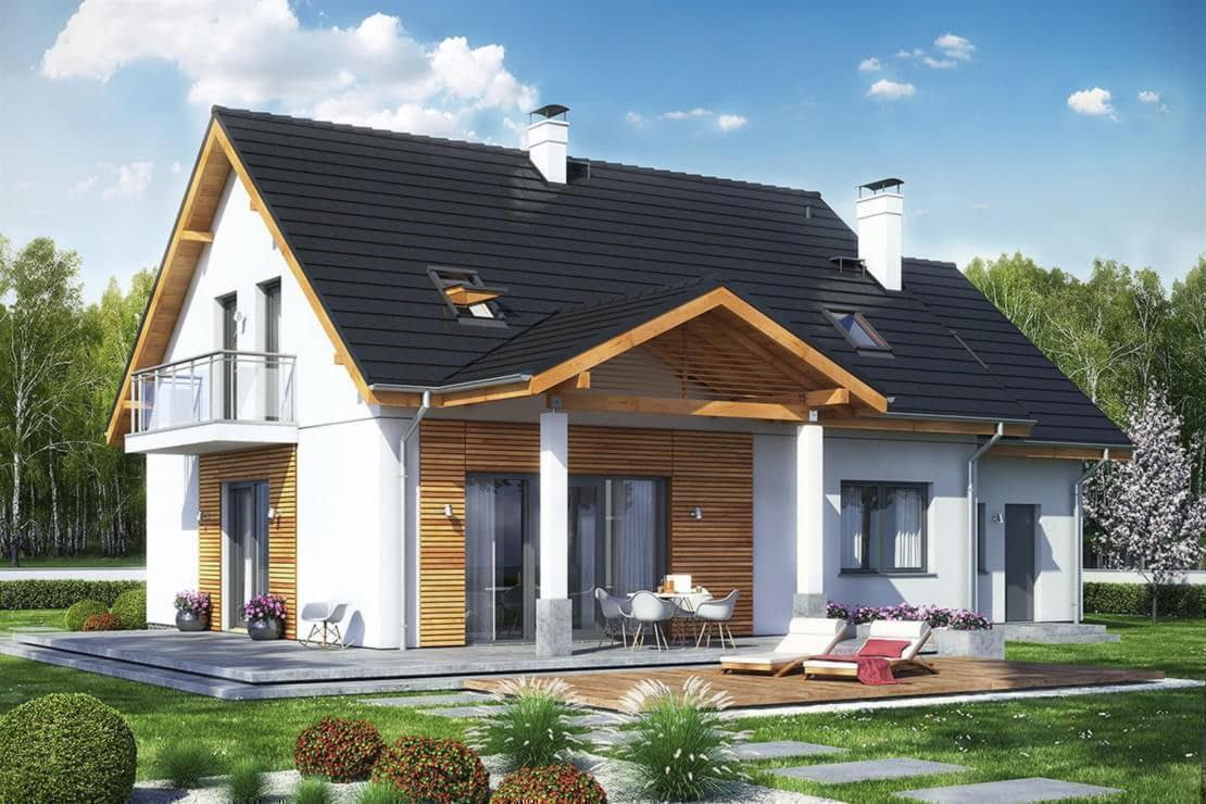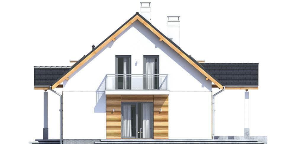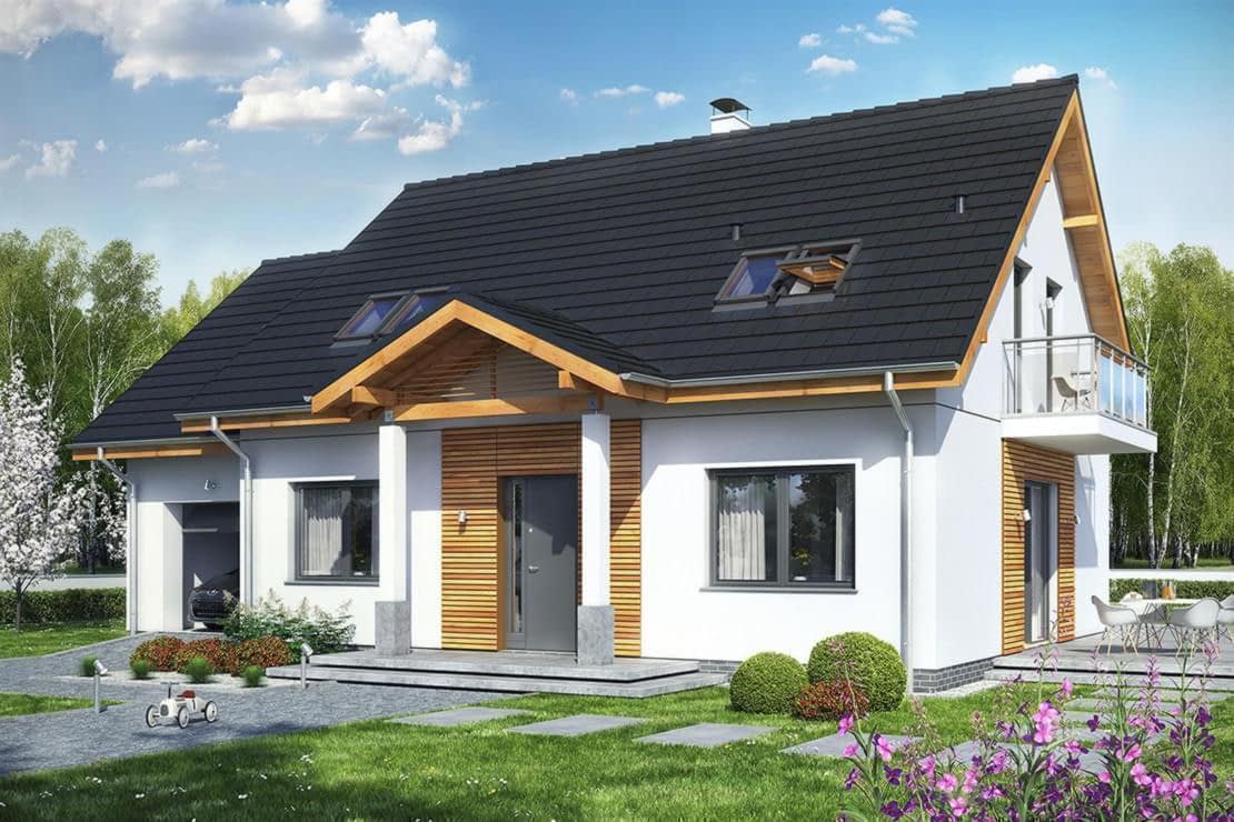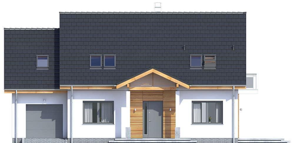 Dom został zaprojektowany dla potrzeb 4-ro lub 5-cio osobowej rodziny. Kompaktowa, zwarta bryła domu jest przekryta dwuspadowym dachem o bardzo prostej konstrukcji drewnianej. Dom zaprojektowano dodatkowo z zadaszeniem nad wejściem głównym i tarasem oraz dobudowanym garażem jednostanowiskowym. Proste i funkcjonalne wnętrze zakłada strefę dzienną wraz z pokojem gościnnym na parterze oraz w pełni rozkładową strefę nocną na poddaszu. Przestronny, otwierający się na ogród salon z jadalnią dopełniono zaprojektowanym zadaszonym tarasem, który doskonale sprawdzi się jako miejsce na letnie posiłki. Możliwość adaptacji pomieszczenia strychu nad garażem na dodatkowy pokój mieszkalny jest dodatkowym atutem tego budynku. Optymalna wysokość ścianki kolankowej, jaka została zaprojektowana, pozwala na uzyskanie komfortowej powierzchni mieszkalnej na poddaszu i zachowanie idealnych proporcji bryły obiektu. Budynek stanowi kompromis tradycyjnej formy, współczesnej estetyki oraz regionalnych materiałów, takich jak elewacyjna okładzina drewniana, cegła klinkierowa, czy szlachetna dachówka. Ponadczasowa architektura tego średniej wielkości domu sprawia, że z łatwością wpisze się w niemal każdy krajobraz.