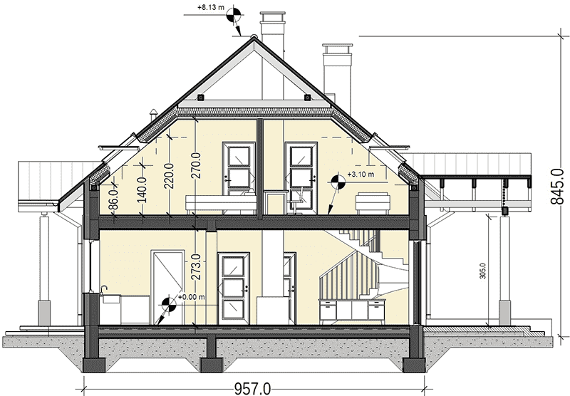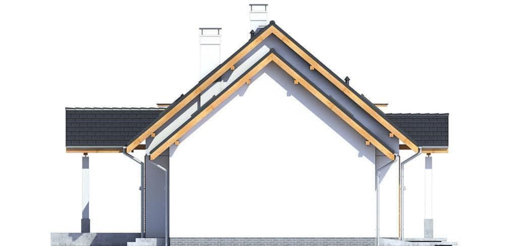Posadowienie bezpośrednie na zbrojonych ławach i stopach fundamentowych wykonanych z betonu B 20. Ściany fundamentowe: murowane z bloczków betonowych M6. Ściany zewnętrzne: bloczki gazobetonowe gr. 25cm na zaprawie systemowej, ciepłochronnej, ocieplony styropianem fasadowym gr. 15cm. Do ocieplenia budynku zaprojektowano użycie styropianu grafitowego gr. 15 cm, o współczynniku „lambda” nie przekraczającym 0,035 W(mK) i „oporze cieplnym” nie mniejszym niż Rd – 4,0 m2k/W. Zastosowanie materiałów budowlanych (ocieplenie ścian, dachu, podłogi na gruncie, okien i drzwi zewnętrznych) użytych w projekcie odpowiada nowym wymaganiom obowiązującym od stycznia 2021 roku (WT2021). Ściany nośne wewnętrzne: bloczki gazobetonowe gr. 25cm na zaprawie cementowo-wapiennej lub systemowej. Ściany wewnętrzne działowe: bloczki gazobetonowe gr. 12cm. Strop gęstożebrowy z wypełnieniem pustakami betonowymi, zalewany wraz z wieńcami betonem B 20. Konstrukcja dachu: drewniana, drewno klasy C24, więźba dachowa krokwiowo-jętkowa. Budynek, w wersji podstawowej, jest zaprojektowany z pomieszczeniem kotłowni wyposażonej w kocioł ekologiczny na paliwo stałe „pellet” i spełnia wszystkie wymagania dotyczące WT2021. Na etapie adaptacji projektu jest możliwość zaprojektowania ogrzewania gazowego ze wspomaganiem instalacją solarną lub ogrzewania nowoczesną pompa ciepła typu powietrze – woda. Projekt pod względem konstrukcyjnym spełnia normy zgodne z Eurokodami.