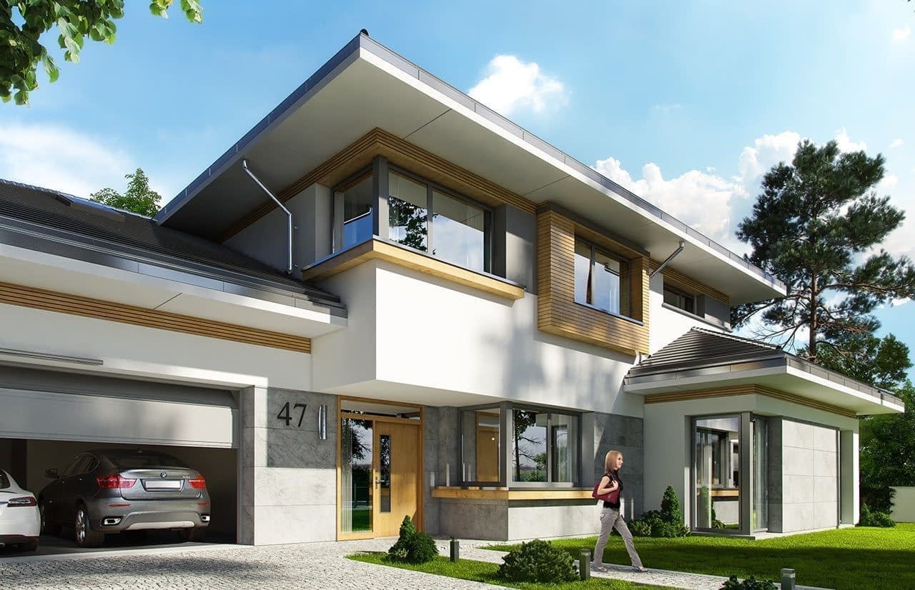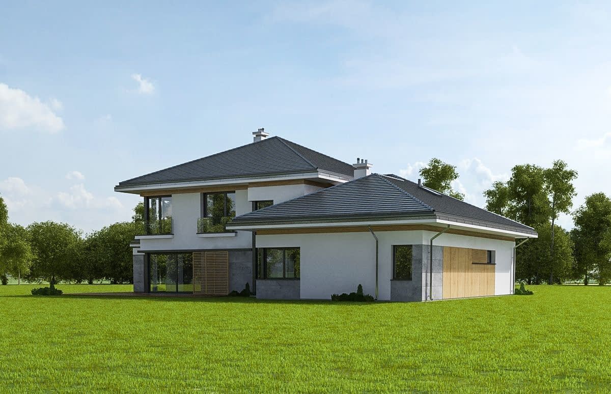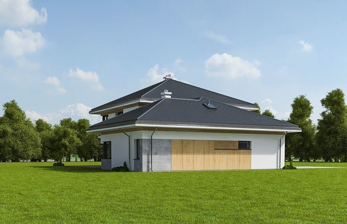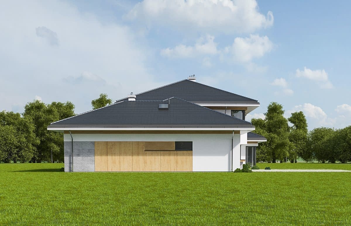 Wariant z podniesionym kątem nachylenia dachu do 30 stopni, obniżonym głównym dachem o 24 cm, pomniejszonym pokojem rekreacyjnym na parterze o 91 cm, zwiększonym zadaszeniem nad tarasem.